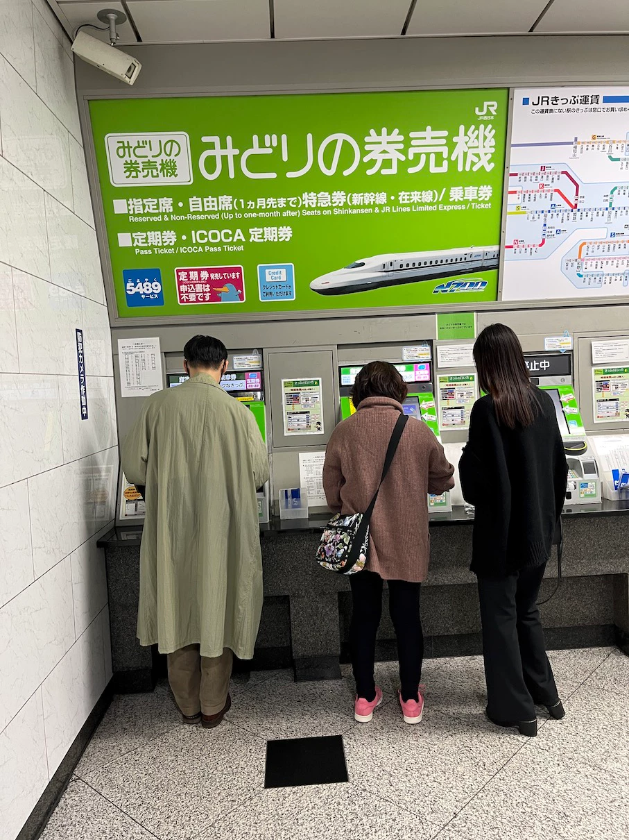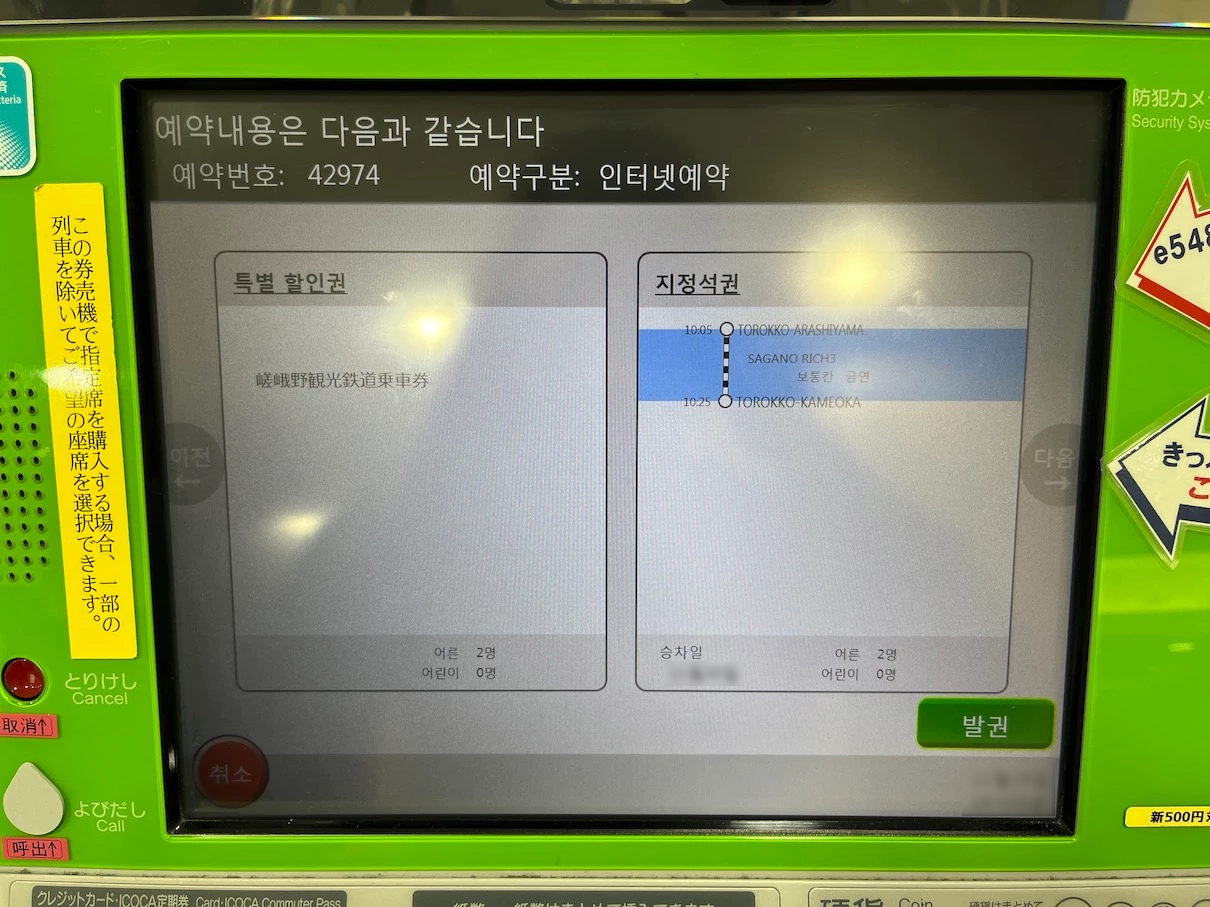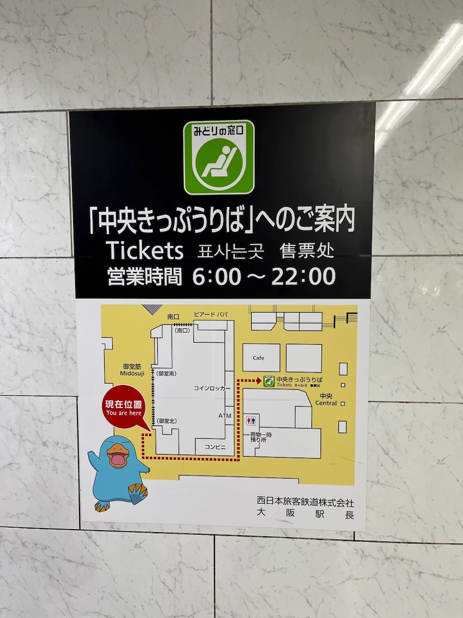 오사카역에 있는 초록창구(미도리노마도구치)에서 한 달 전에 예약했던 토롯코열차 티켓을 수령해요.