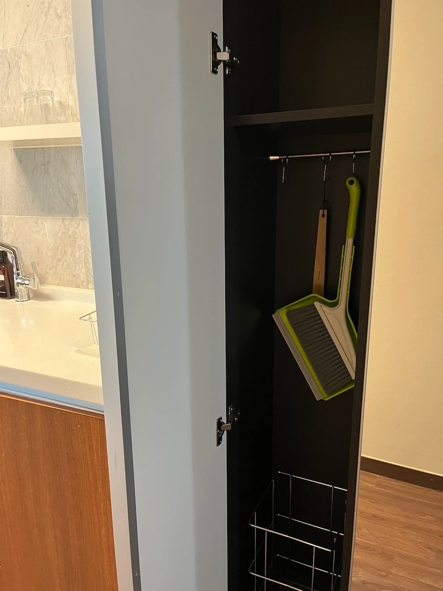 들어가서 바로 보이는 전신거울 쪽을 보면, 간단한 수납장이고 한쪽은 구둣주걱과 빗자루가 있습니다.