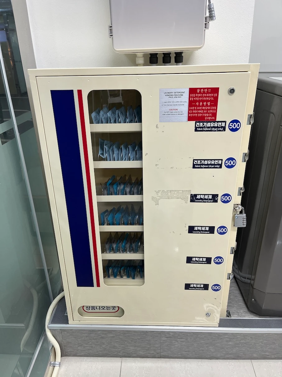 세제와 섬유유연제를 판매하는 자판기, 지폐교환기가 있습니다. 세제와 섬유유연제 모두 개당 500원입니다.