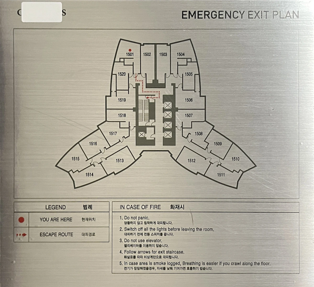 객실 문 안쪽에 있는 비상대피안내에 있는 배치를 보면, 위에서 보면 뿔 3개가 난 형태의 빌딩이라 위의 15층 평면도 기준으로 1501호부터 1504호까지가 해운대해수욕장을 정면으로 바라보는 모습입니다.