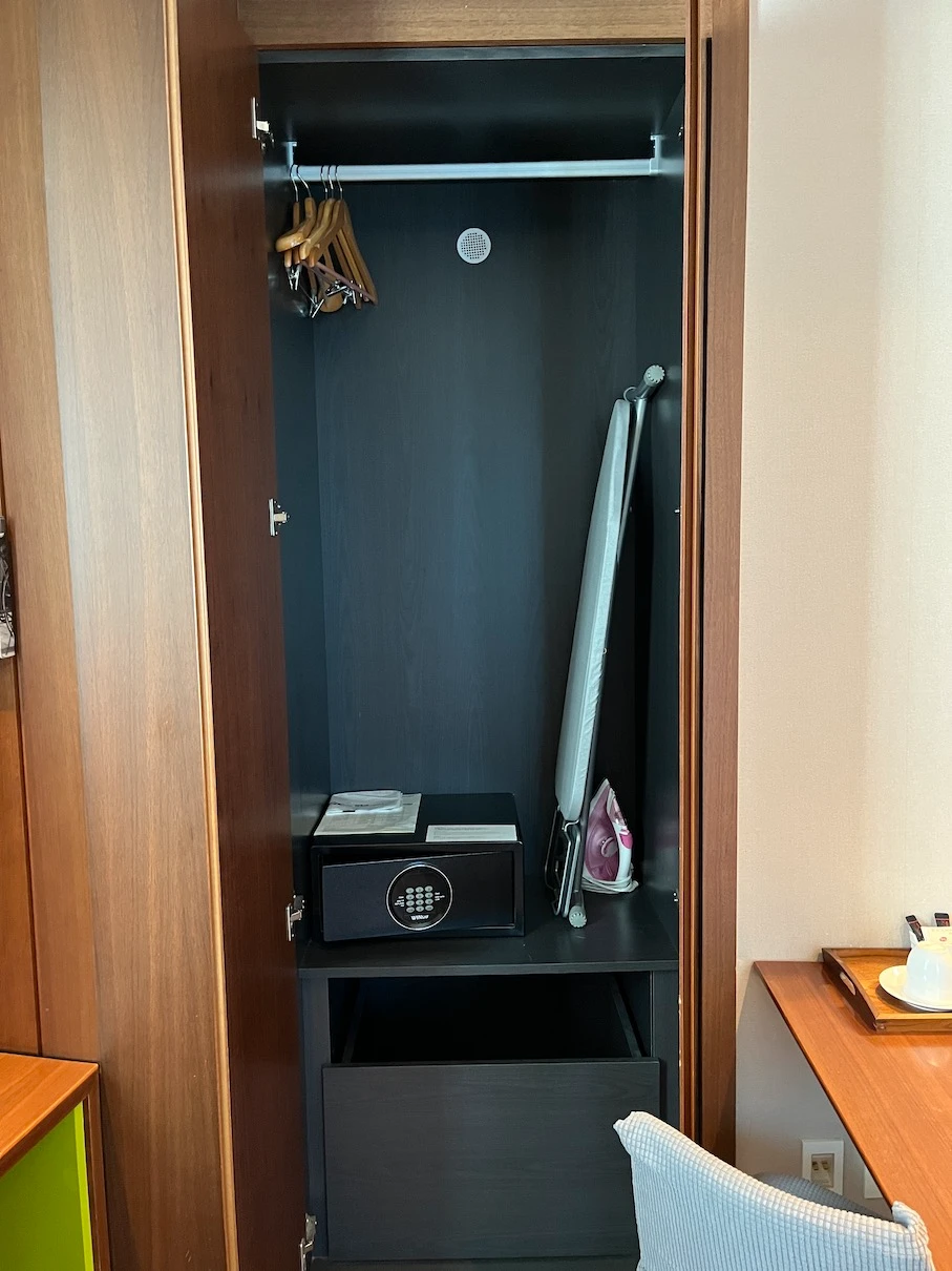 옷장 내부에는 다리미판과 다리미, 금고가 있습니다.