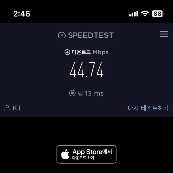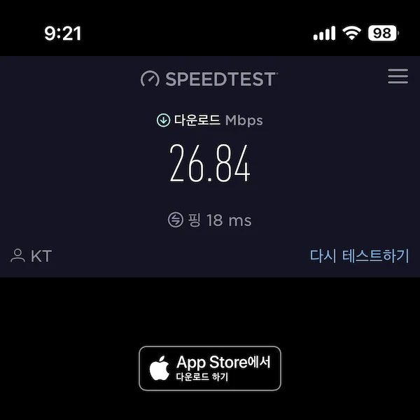 오후 2~3시 경에는 40~50Mbps 정도의 속도, 오후 9~10시 경에는 20~30Mbps 정도의 속도를 보여줬습니다.