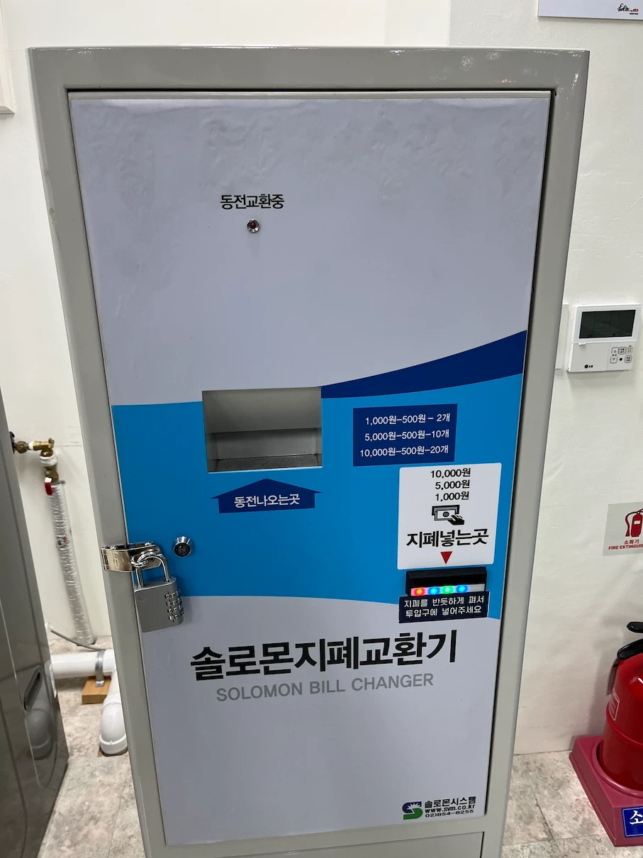 세제와 섬유유연제 자판기는 500원 동전만 받기에 지폐교환기를 사용해야 합니다.