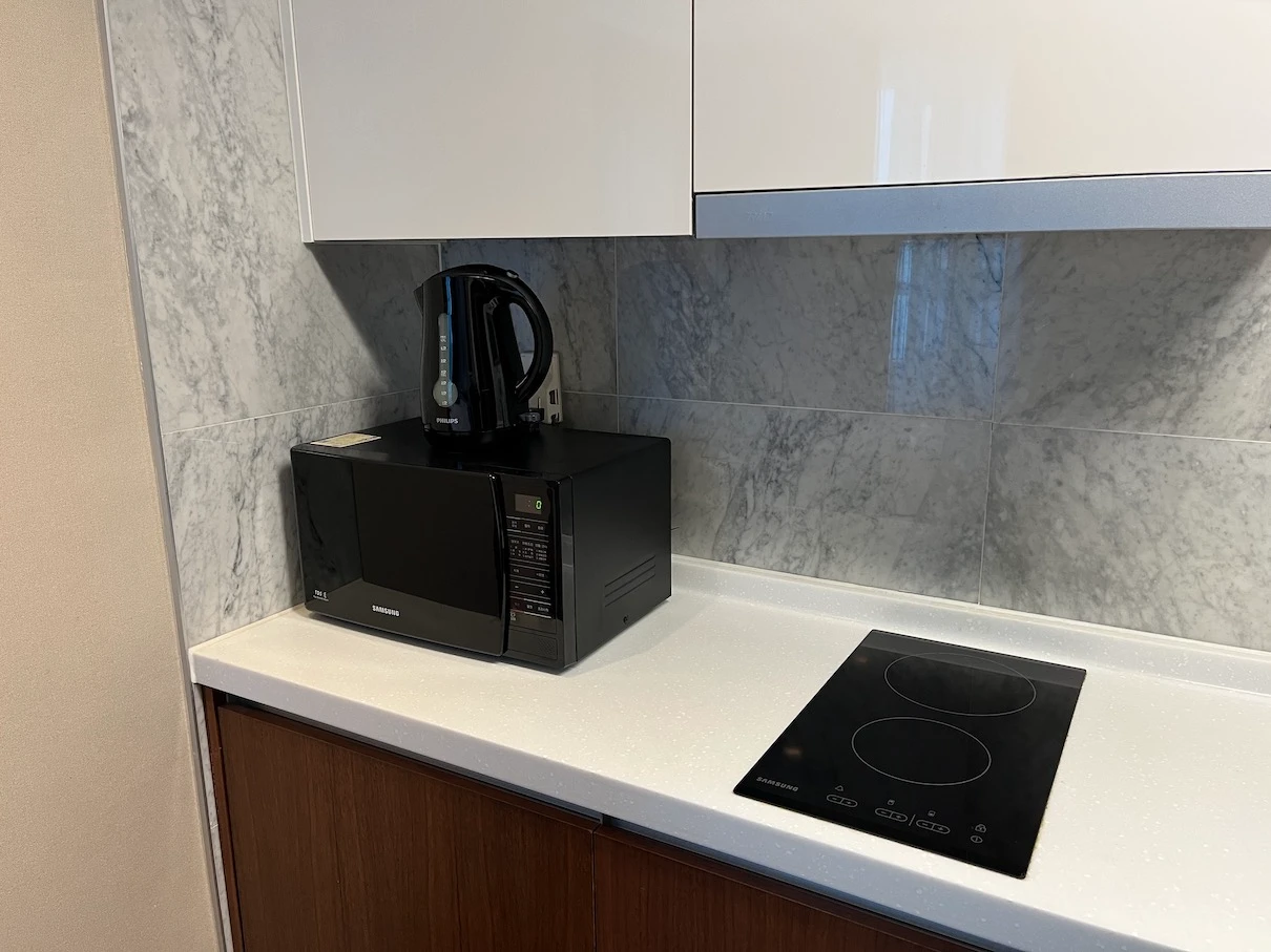 - 레지던스 형태라 전자레인지, 인덕션, 조리기구, 밥솥 등 구비되어 있음