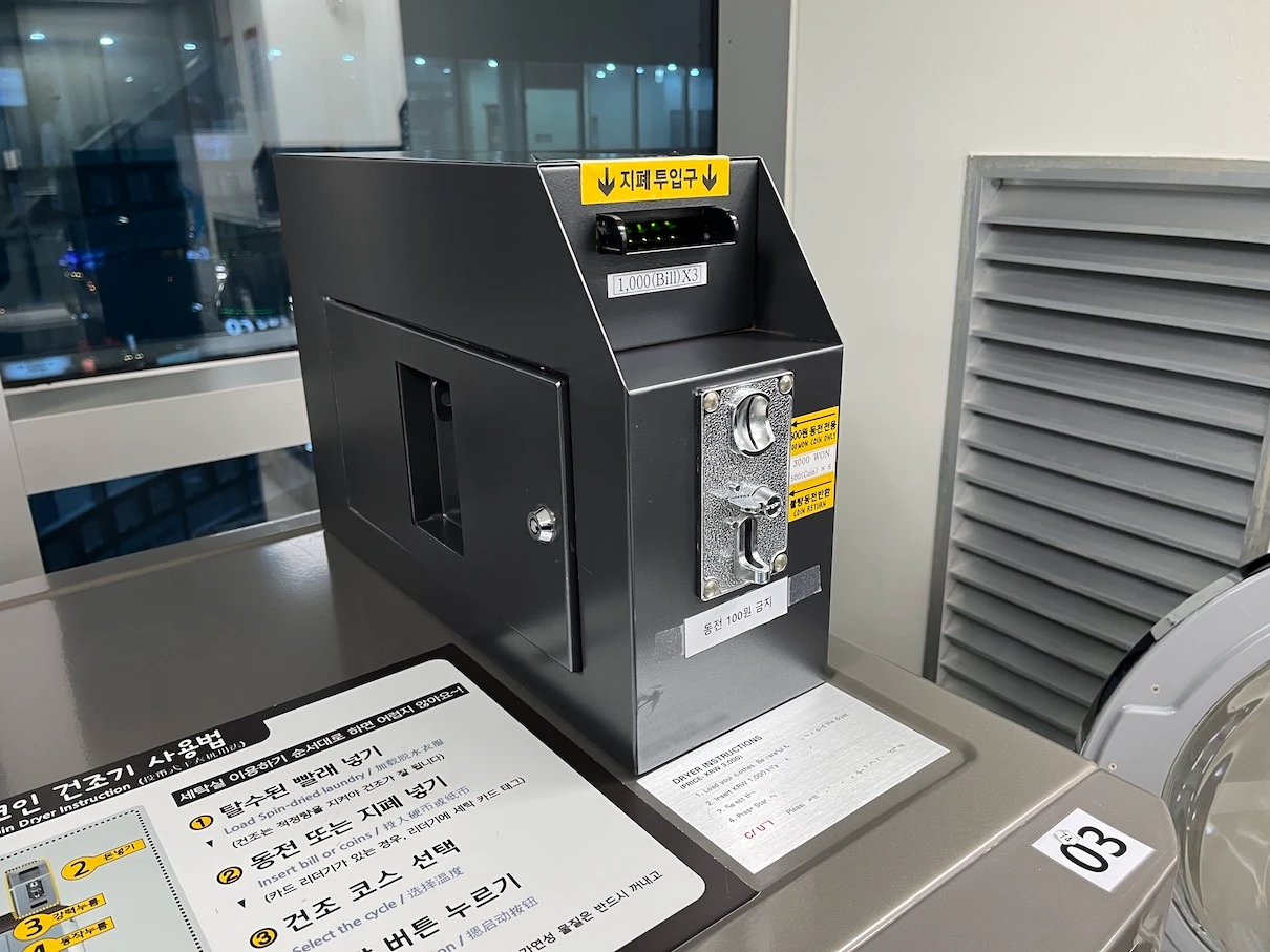 건조기는 사용방법이 간단합니다. 세탁이 완료된 세탁물을 넣고 돈을 넣고 건조 코스를 선택하고 동작 버튼을 누르면 됩니다.
