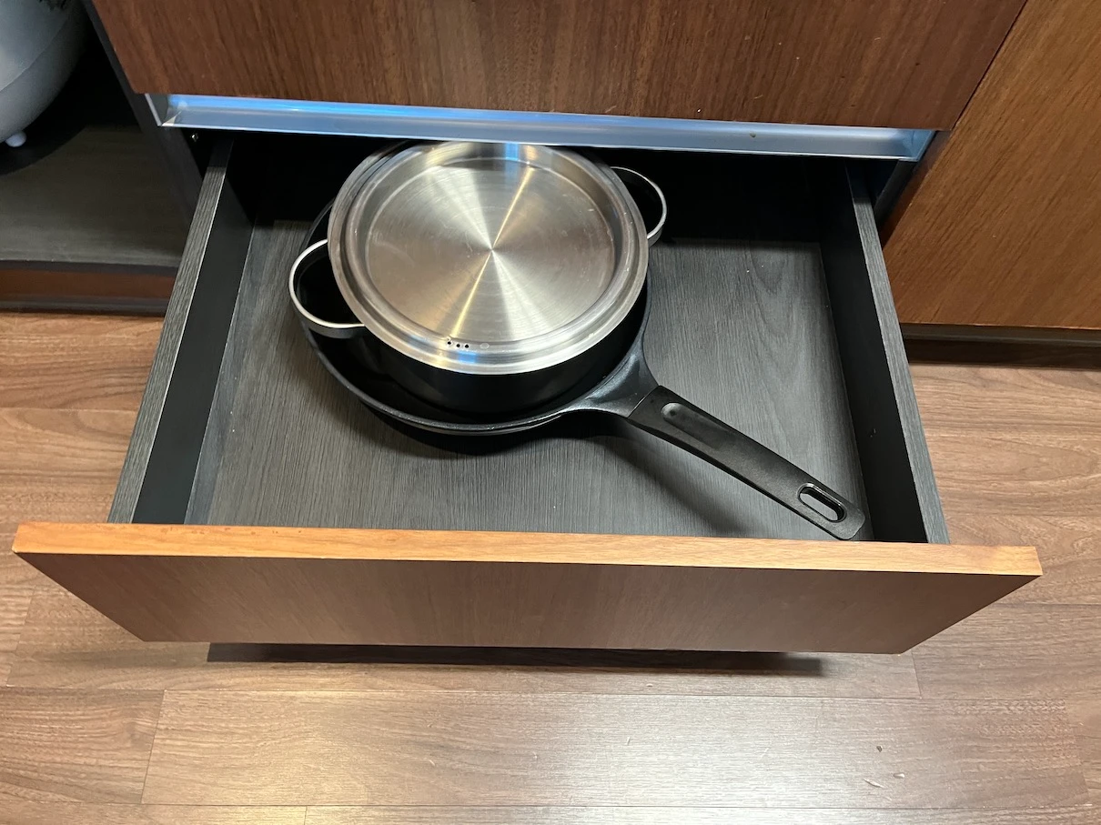 맨 아래 장을 열어보니 냄비와 후라이팬이 하나씩 있습니다.
