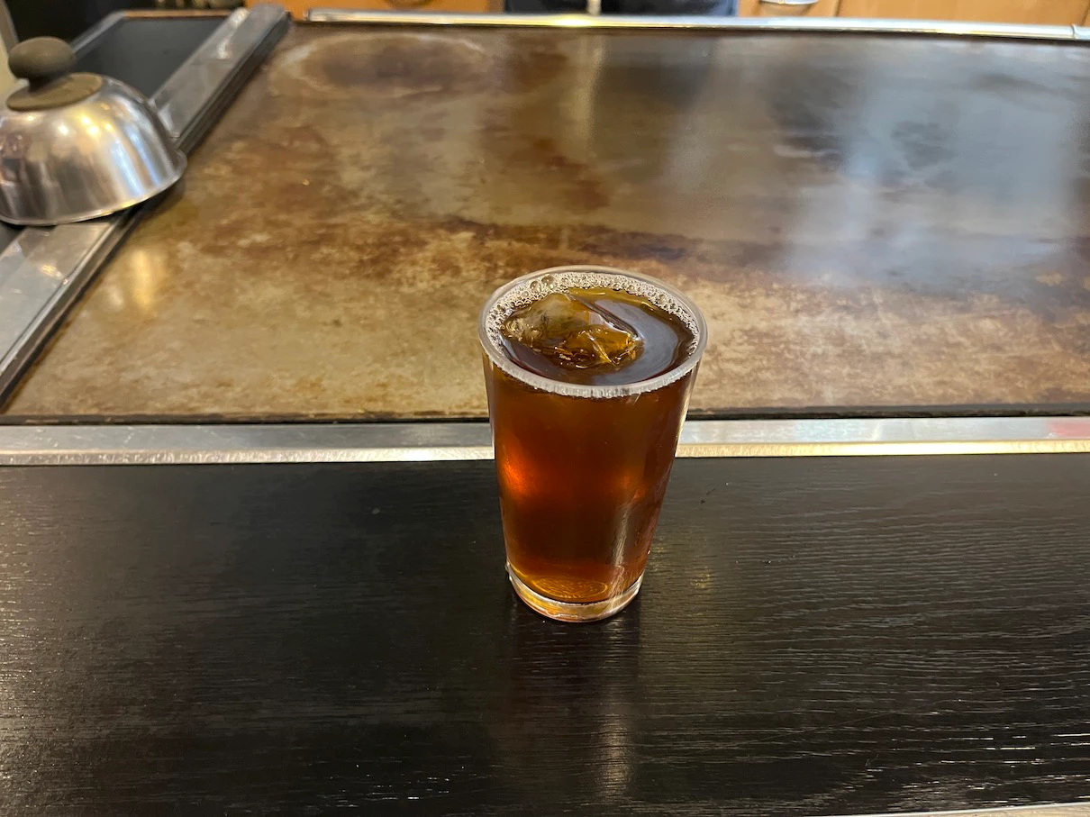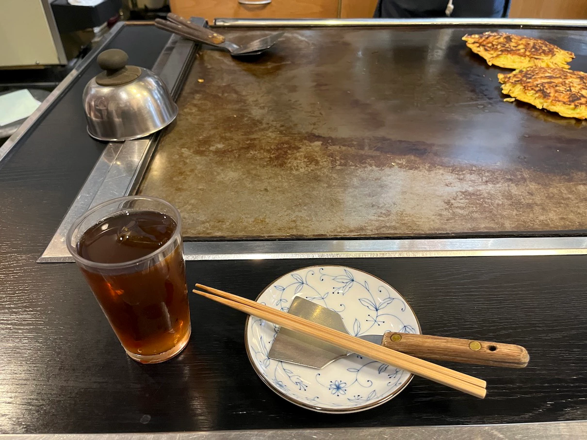 저는 돼지고기, 오징어, 문어가 들어간 콤비네이션 오코노미야키와 우롱차를 주문했어요.