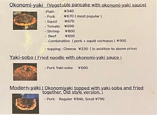 오코노미야키, 야키소바, 야키소바와 오코노미야키를 합친 모던야키가 있네요.