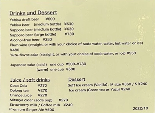 음료는 맥주류와 논알콜 맥주, 사케, 콜라, 우롱차, 오렌지 주스 등이 있어요.