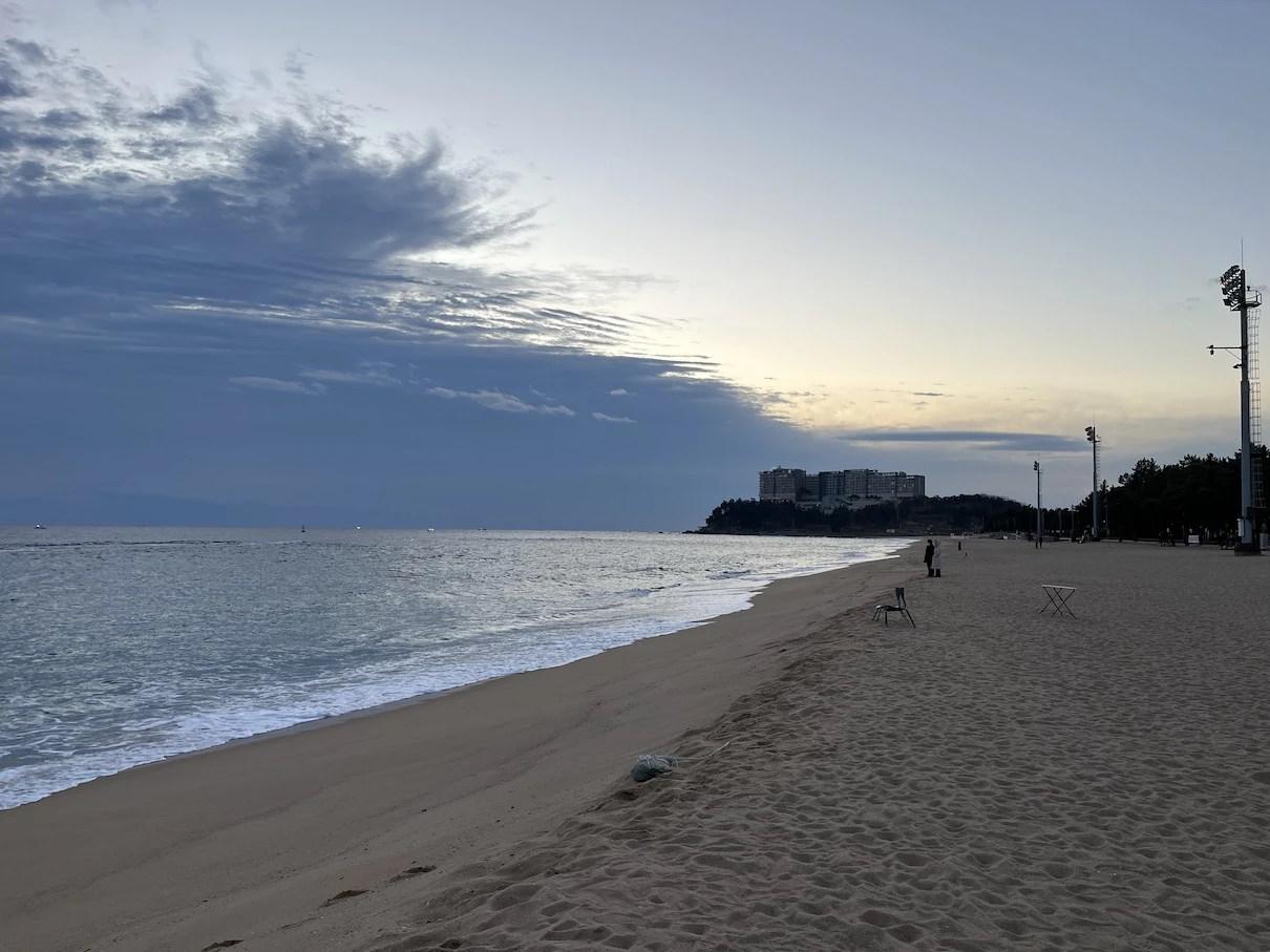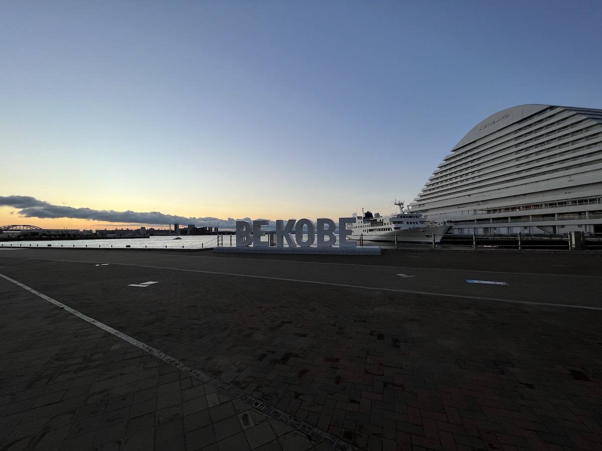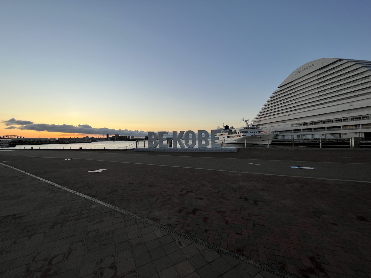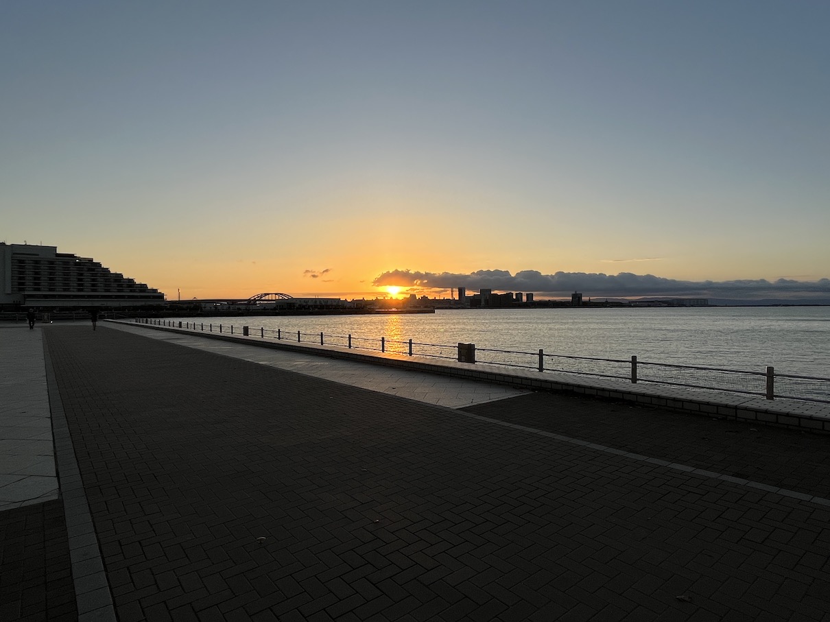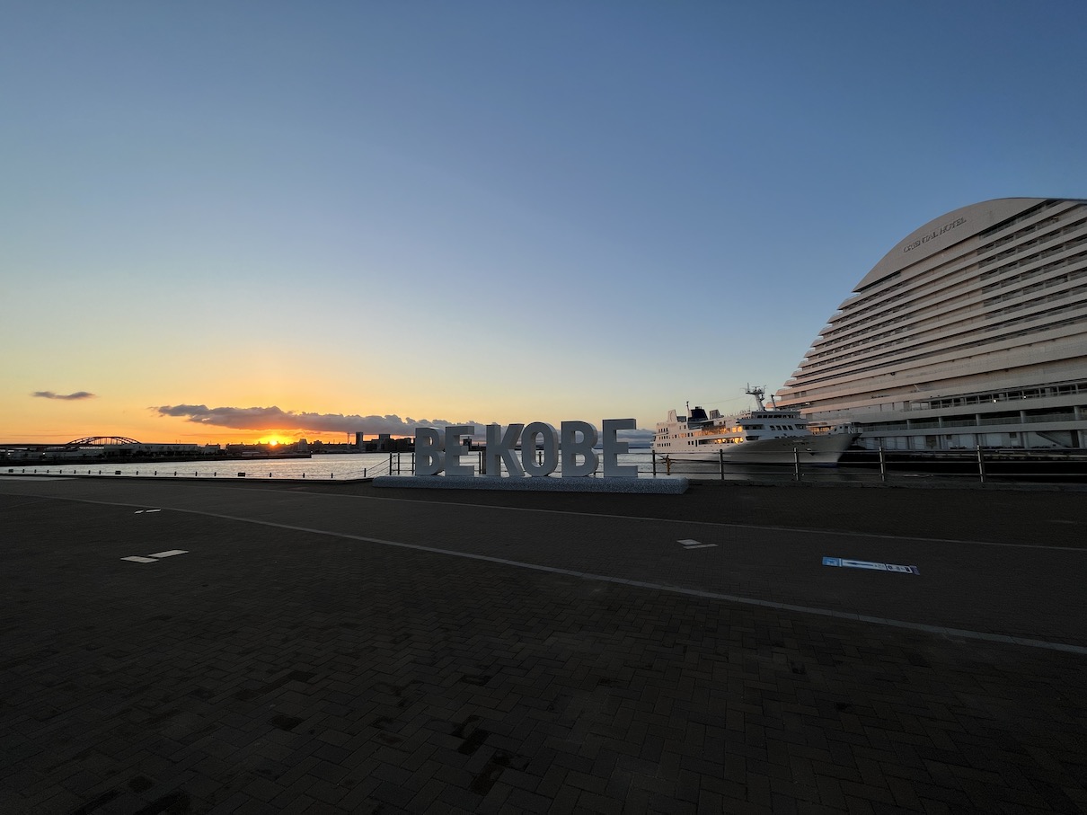 고베 메리켄공원의 경우 대략 11월부터 1월 정도까지만 바다 쪽에서 뜨는 모습을 볼 수 있습니다. 12월에 방문했는데도 BE KOBE 조형물에서 꽤 각도가 꺾인 느낌입니다. 동지인 12월 21~22일에 가까운 시점이라면 조금 더 가까운 쪽에서의 일출을 볼 수 있을 것이라 생각합니다.