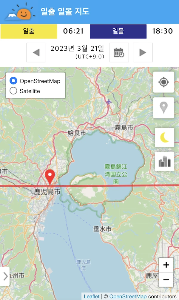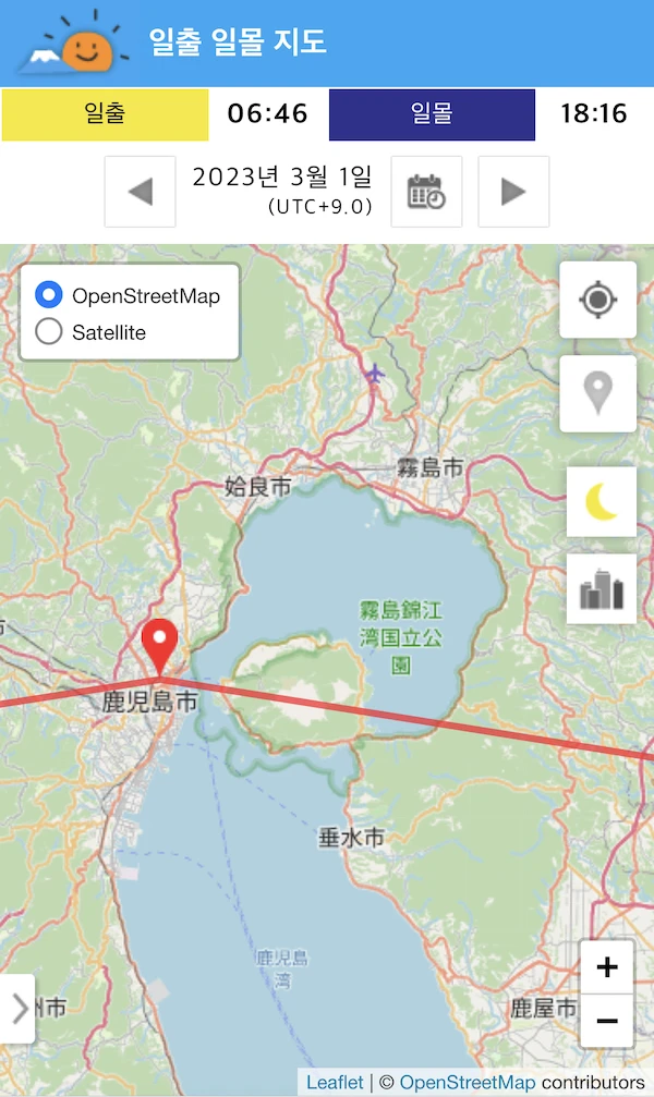 사쿠라지마 중앙 부분에서 태양이 뜨는 일출을 보고 싶다면 2월 말에서 3월 초, 10월 초에서 10월 중순 정도에 볼 수 있을 것 같습니다.(일출시간 및 위치 지도로 확인했습니다)