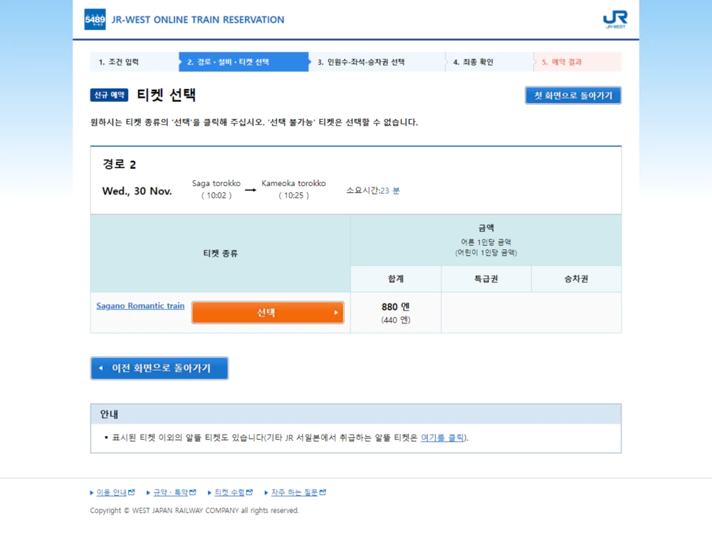 링크를 타고 들어갈 경우 열차가 선택되어 있는데, 혹시라도 선택되어 있지 않다면 'Sagano Romantic Train'을 선택해줍니다.