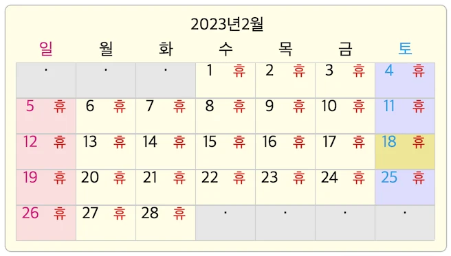 홈 > 운행 스케줄 열차운행에 관한 공지사항 오늘은 운행 휴무일입니다. 2023년2월 일 월 화 수 목 금 토 ・ ・ ・ ・ ・ ・ ・ --> (참고) 글자가 기재되어 있지 않은 날은 정규편만 운행하