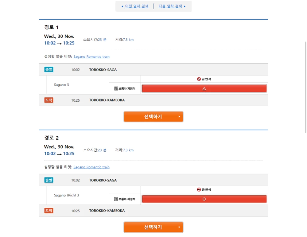 출발/도착역과 시간도 지정해 줍니다. 저는 토롯코 아라시야마역에서 토롯코 가메오카역으로 가는 구간을 예매합니다.