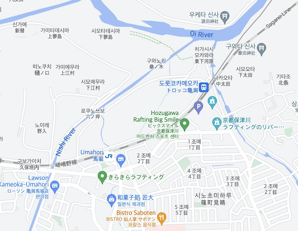 토롯코 가메오카역에서 JR 우마호리역까지는 걸어서 5~7분 정도 걸립니다.