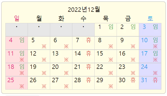 운행 스케줄입니다. 참고를 위해 2022년 11월, 12월과 2023년 2월, 3월 스케줄을 가져왔습니다.
