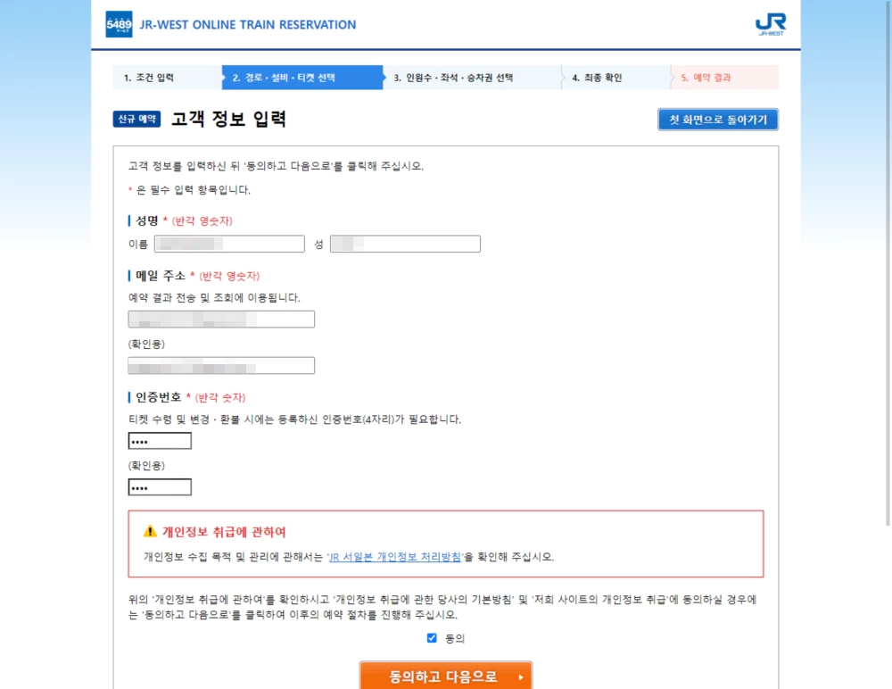 인증번호는 원하는 숫자 4자리를 입력하면 되는데 예매한 티켓을 일본 현지 역에서 수령하기 위해서 필요합니다. 까먹지 않도록 입력 후 4자리는 적어둡니다. 티켓 변경/환불 시에도 인증번호로 적은 숫자 4자리가 필요합니다.