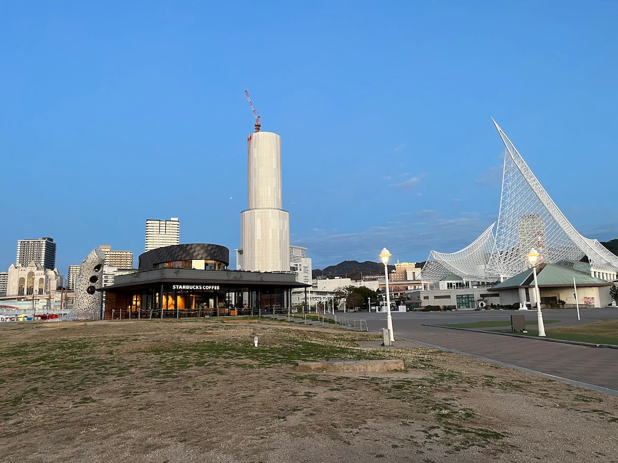 스타벅스, 고베 포트 타워(공사중), 고베 해양 박물관(일부 잘림)을 한 장에 담았어요.