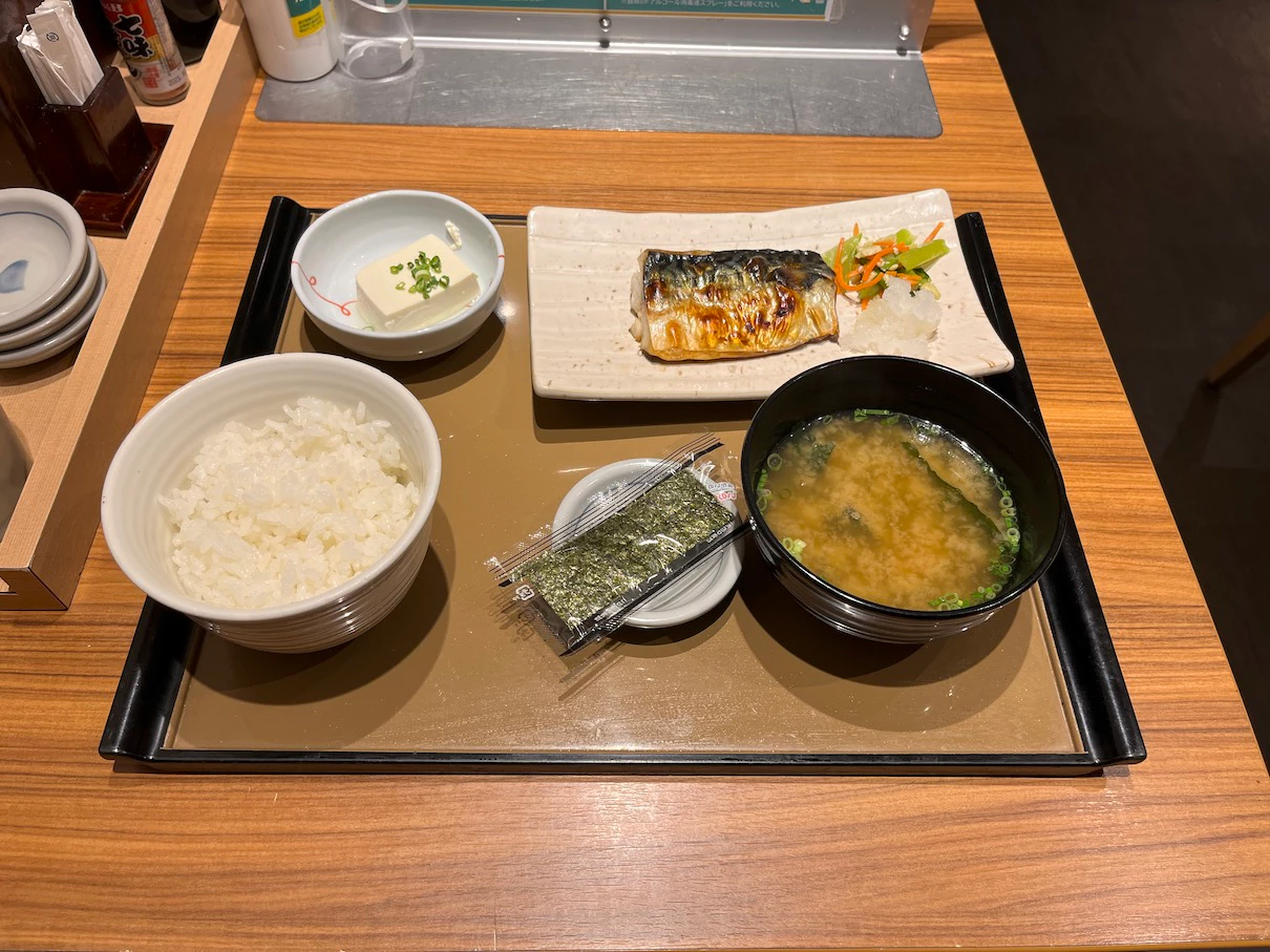 일행은 계란과 낫토가 있는 조식과 가라아게(닭튀김) 5개를 선택하고, 저는 고등어구이 조식을 선택했어요.
