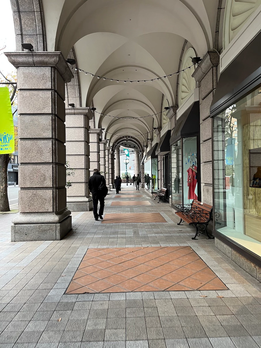아까 올 때 봤던 선물모양 장식을 한 상점가 입구에요.
