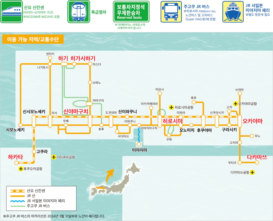 이용가능 주요도시 : 후쿠오카(하카타), 기타큐슈(고쿠라), 시모노세키, 야마구치, 히로시마, 오카야마, 다카마쓰