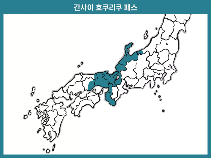 간사이 지역(오사카, 교토, 고베, 나라, 히메지, 오카야마 등)과 호쿠리쿠 지역(가나자와, 도야마, 등)을 이용할 수 있는 패스입니다.