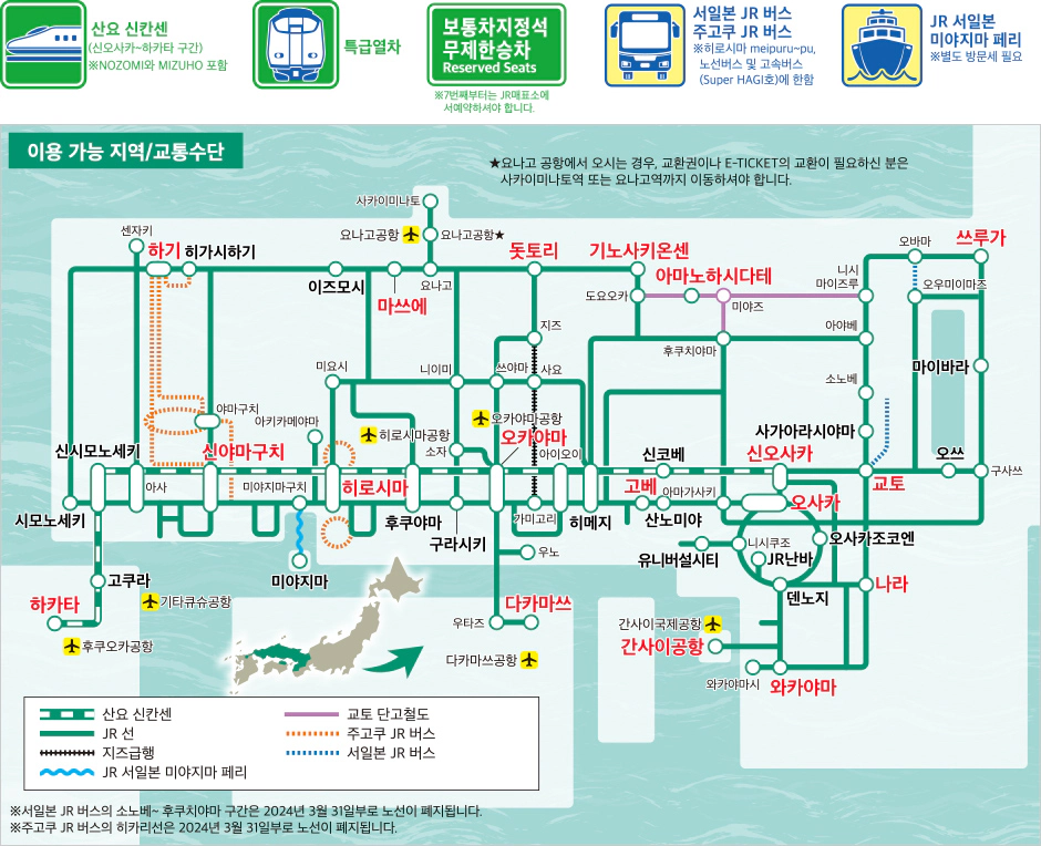 참고로, 작성일 기준 직항 항로가 없어 우리나라 사람들이 여행을 가서 일반적으로 사용하기 어려운 패스들(산인 오카야마 패스, 호쿠리쿠 패스)은 제외하였습니다.