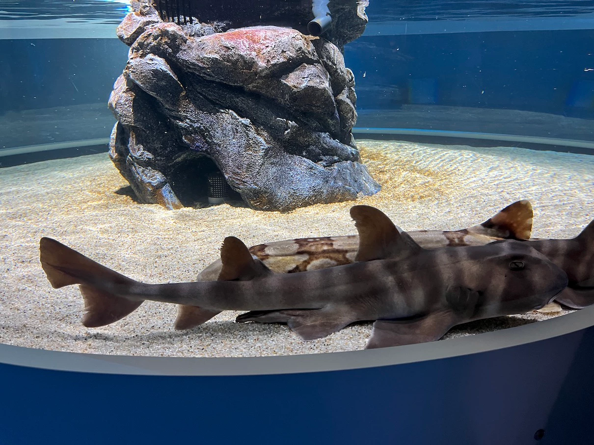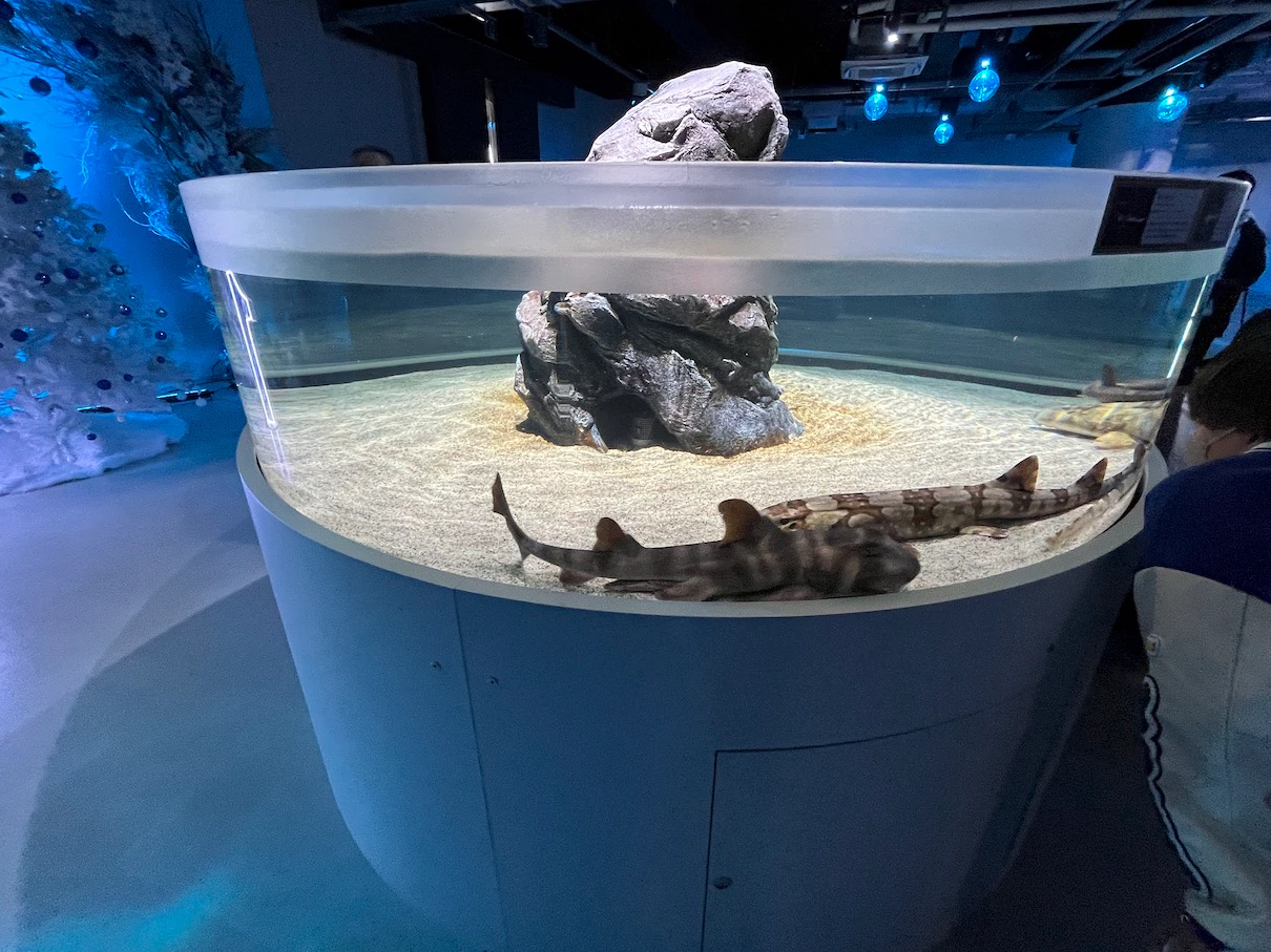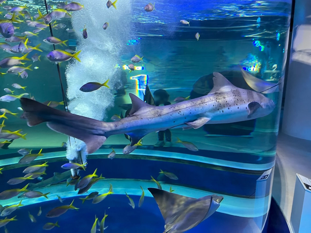 잠시 수조를 다시 한번 보는데 마침 가오리가 쌩 하고 지나가고 그 뒤를 상어가 지나가네요.