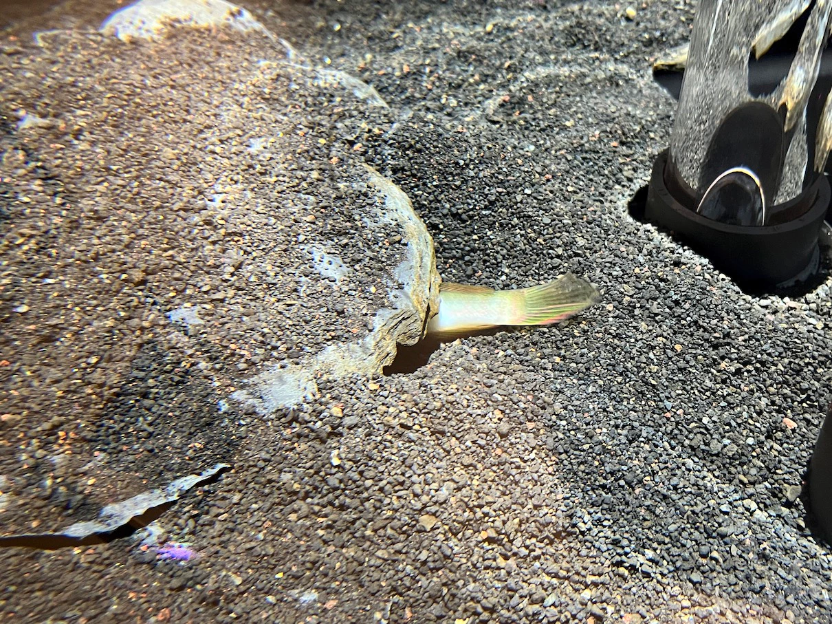 처음에는 숨으려고 했는지 꼬리만 보이다가 그다음에는 머리만 내밀고 있어서 머리만 보이는 어찌 보면 귀여운 물고기네요.