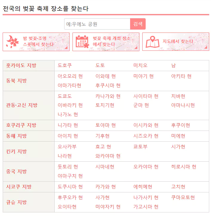 위에서 올렸던 링크를 내려가보면 '전국의 벚꽃 축제 장소 찾기'가 나옵니다. 일본어로 되어 있지만 웹 번역 정도로도 충분히 찾아볼 수 있습니다.