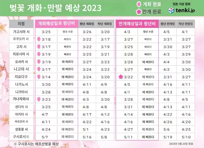 마찬가지로 일본 기상 협회의 정보로, 주요 지역의 평년 대비 개화 및 만개시기를 비교해 본 자료에 따르면 가고시마를 제외한 나머지 지역에서는 평년보다 3~6일 빠른 '꽤 빠른' 경우와 평년보다 7일 이상 빠른 '빠른' 개화 및 만개를 보이는 것으로 예상되었습니다.