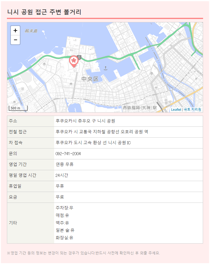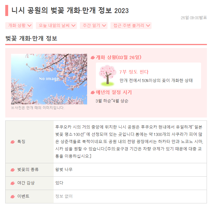 하나 더, 예를 들어 니시 공원을 들어가 보면 현재 개화 정도와 장소의 특징, 해당 지역의 일기예보, 영업시간과 주소 등의 정보가 나옵니다.
