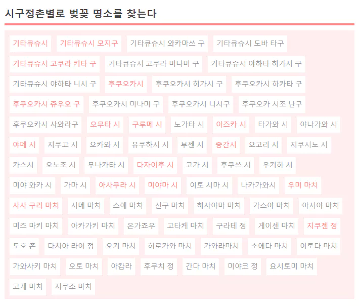 위에서 올렸던 링크를 내려가보면 '전국의 벚꽃 축제 장소 찾기'가 나옵니다. 일본어로 되어 있지만 웹 번역 정도로도 충분히 찾아볼 수 있습니다.