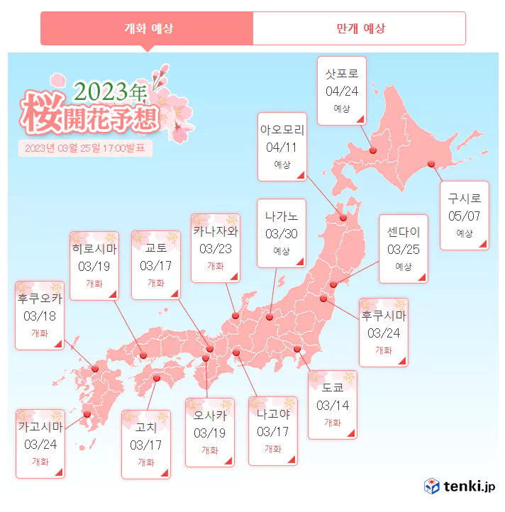 글을 작성하는 시점에서 제일 최신 자료인 3월 25일 자료에 따르면, 도쿄를 비롯해 나고야, 카나자와 등의 중부권, 오사카, 교토 등의 간사이권, 주고쿠권의 히로시마, 시코쿠의 고치와 더불어 큐슈의 후쿠오카와 가고시마는 개화를 한 것으로 나옵니다.