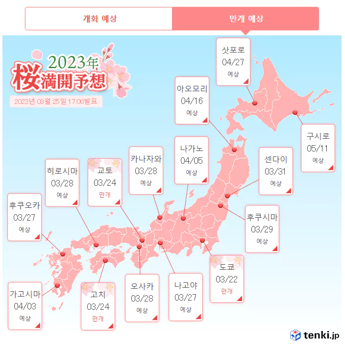 도쿄(도카이), 교토(간사이), 고치(시코쿠)는 이미 만개를 하였고, 조만간 오사카, 나고야, 히로시마, 후쿠오카는 만개가 될 예정입니다.