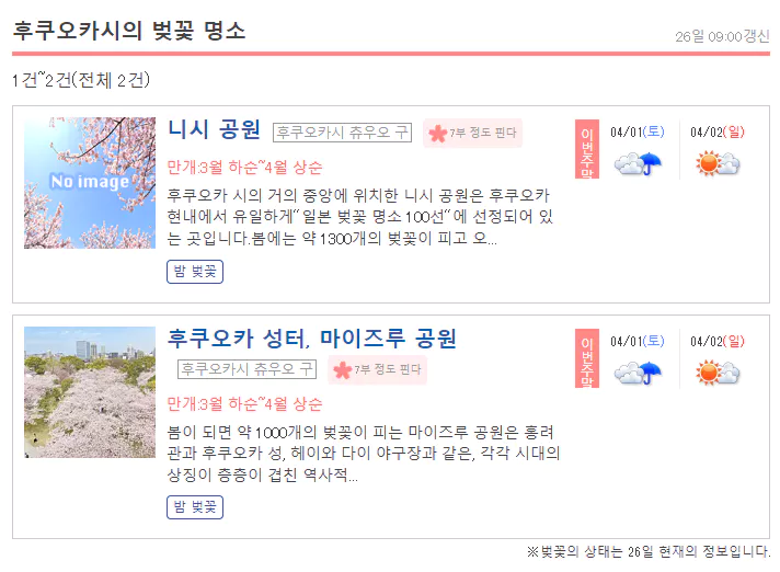 하나 더, 예를 들어 니시 공원을 들어가 보면 현재 개화 정도와 장소의 특징, 해당 지역의 일기예보, 영업시간과 주소 등의 정보가 나옵니다.