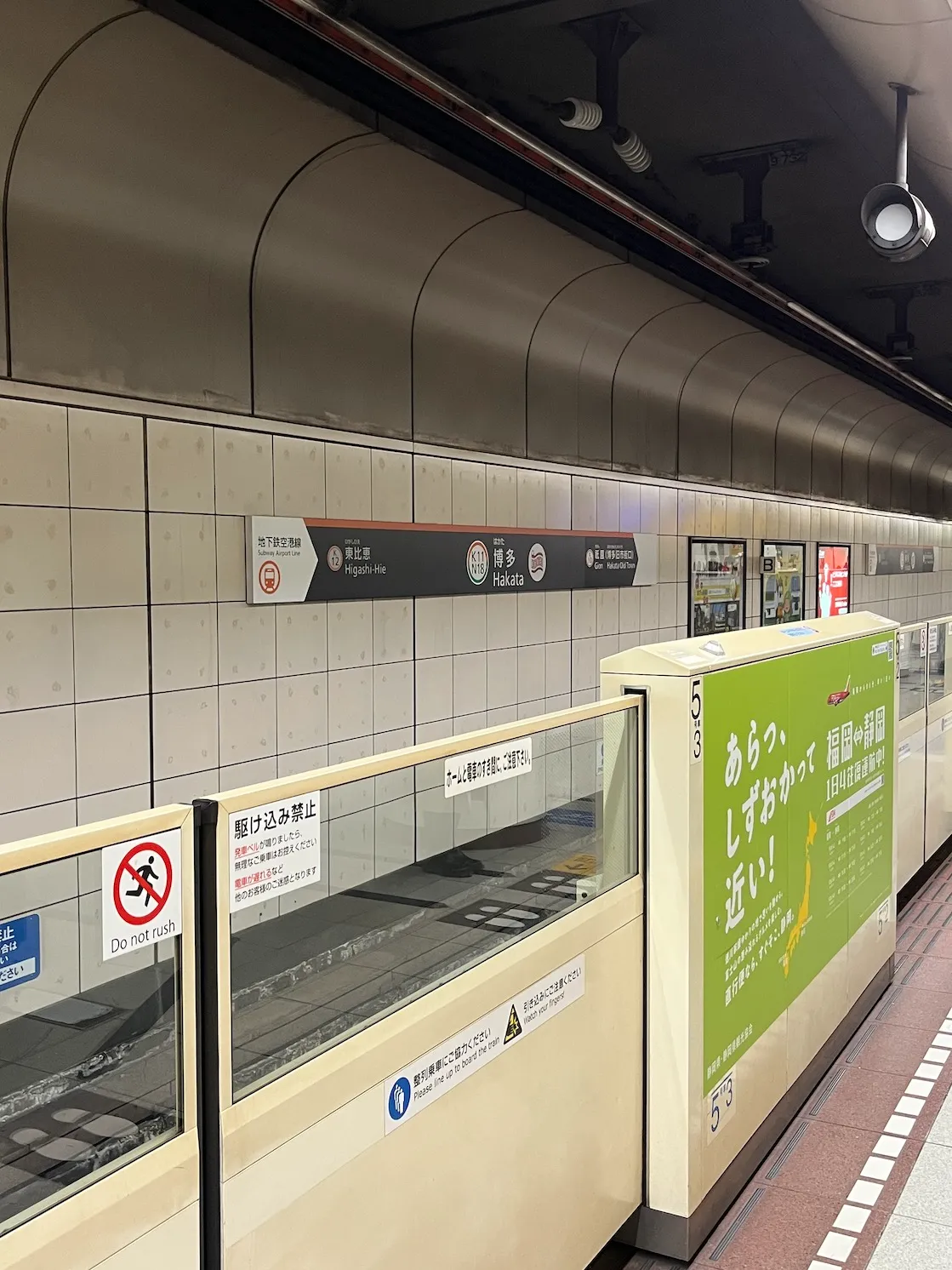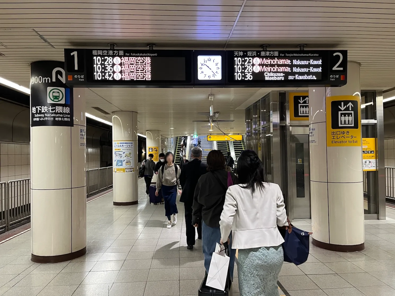지하철을 타고 하카타역에서 내려서 출구로 향해요.
