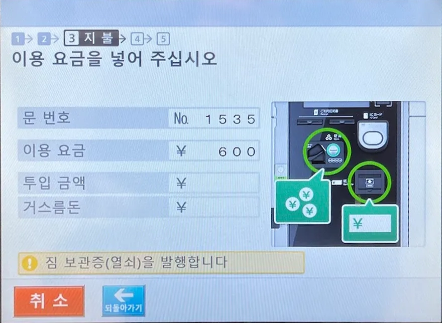 IC카드로 지불하면 짐을 찾을 때 지불했던 IC카드를 태그하는 방식으로 짐을 찾는데, 현금으로 지불했을 경우 위와 같이 보관증이 나오는데 가운데에 있는 QR코드를 찍고 짐을 찾는 방식이기에 저 교환증을 잃어버리면 곤란해져요.