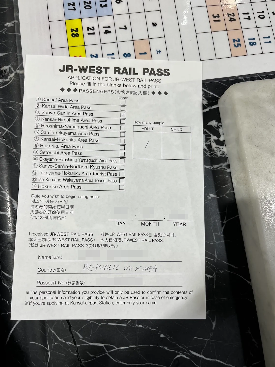창구에서 줄을 서서 기다린 후 국내에서 사전에 구입한 패스의 교환증을 제시하고 위의 종이를 작성하고 패스를 교환받았어요.