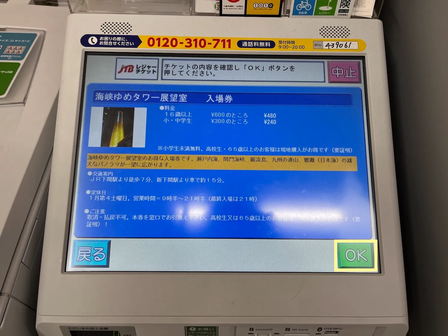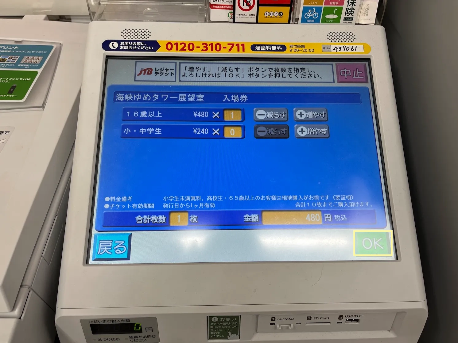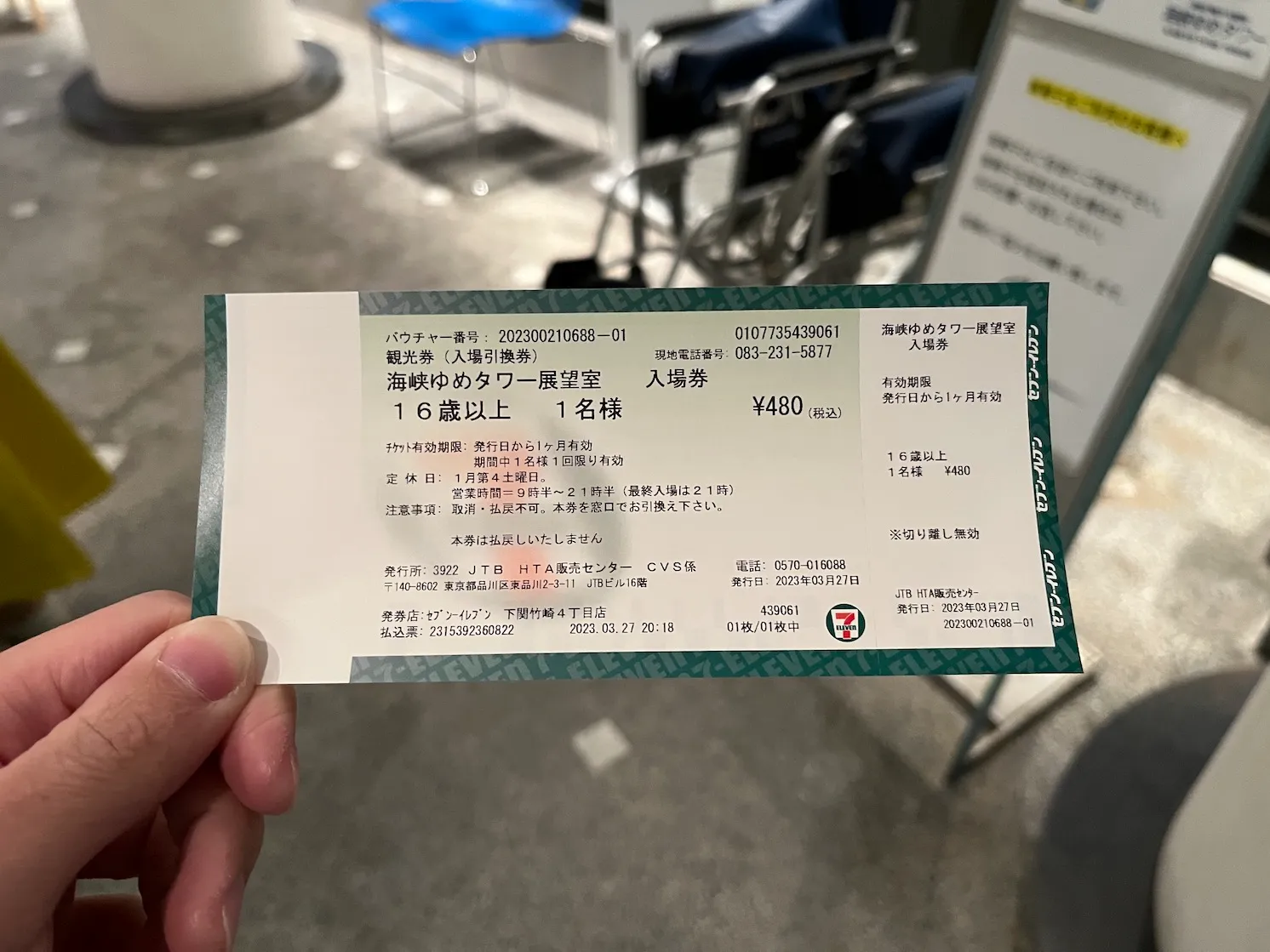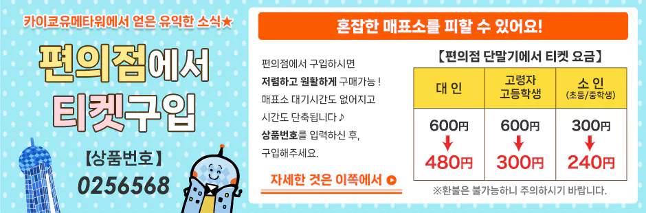그럼 위와 같은 티켓을 받을 수 있습니다. 제가 구입한 것은 카이쿄유메타워 전망대 티켓이었는데 이 티켓을 카이쿄유메타워 전망대에 가서 제시하니 전망대 입장권으로 교환받았습니다.