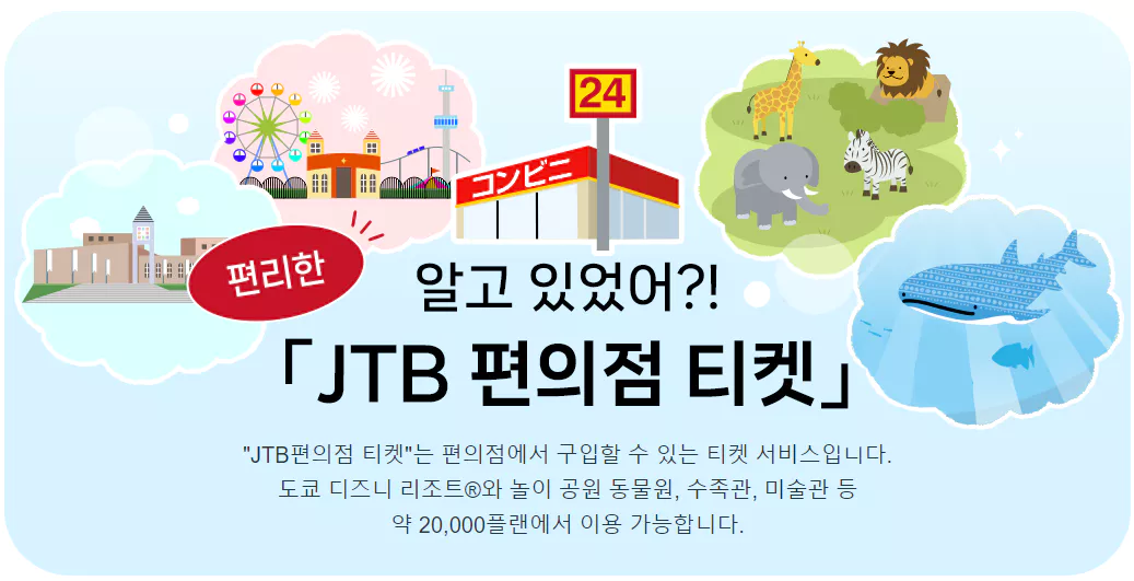 아래의 JTB 홈페이지에서 편의점 티켓으로 구입 가능한 티켓들과 금액 등을 안내하고 있습니다.