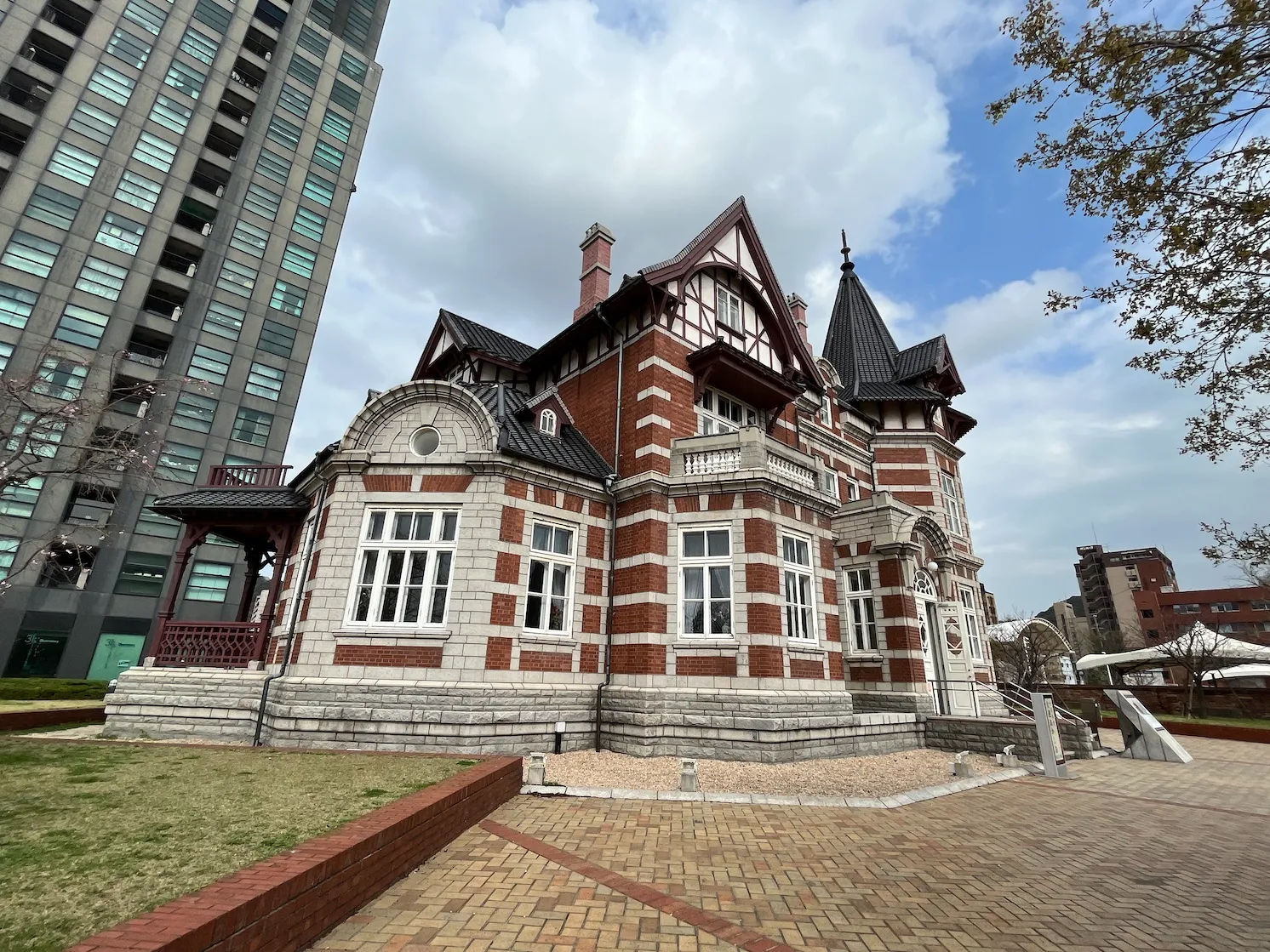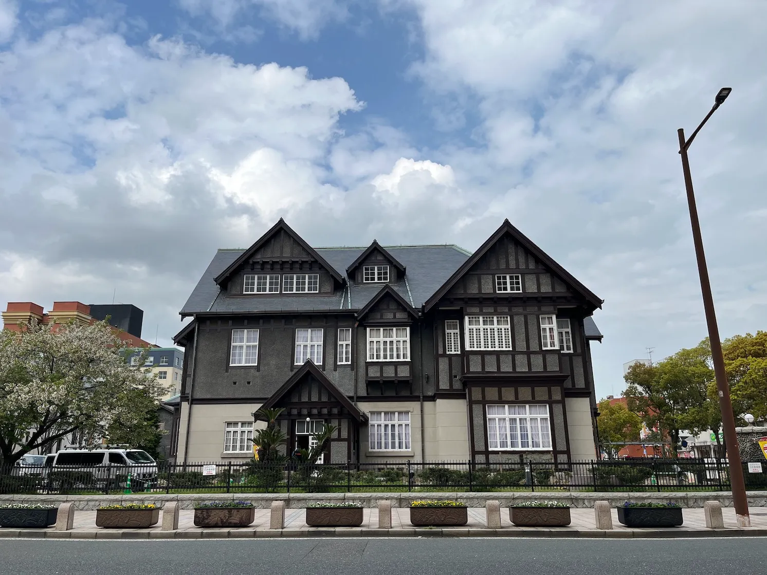 이 건물은 다이쇼 10년인 1921년에 미쓰이물산의 사교 클럽으로서 만들어진 건물이라고 해요. 유럽 전통의 목조 건축 공법인 하프 팀버 양식으로 지어진 것이 특징인데, 목조 골조 사이를 회반죽, 벽돌, 돌 등으로 메우는 식으로 벽을 만들어 목조 골조가 그대로 외관 디자인이 된다는 점이 포인트라고 해요.
