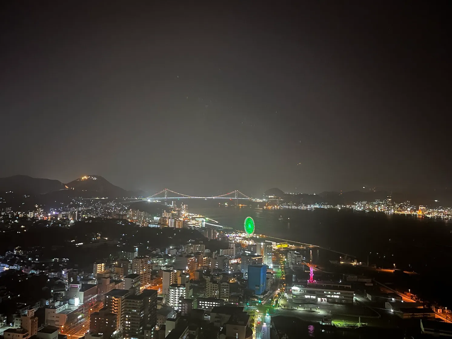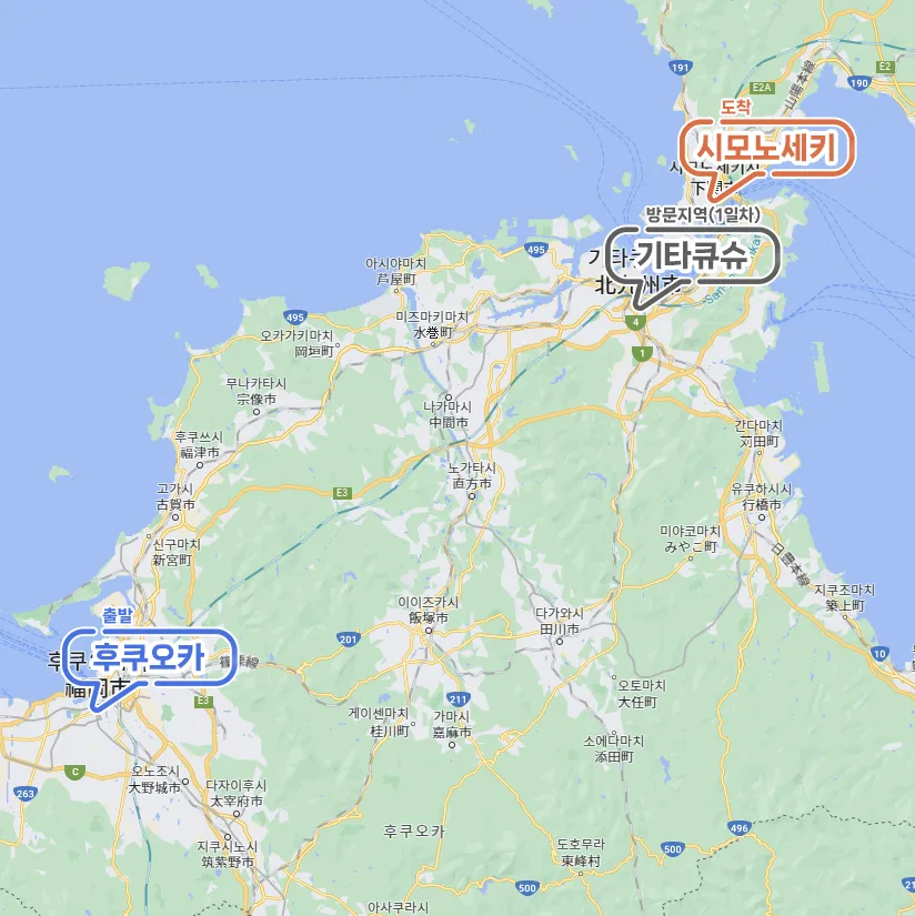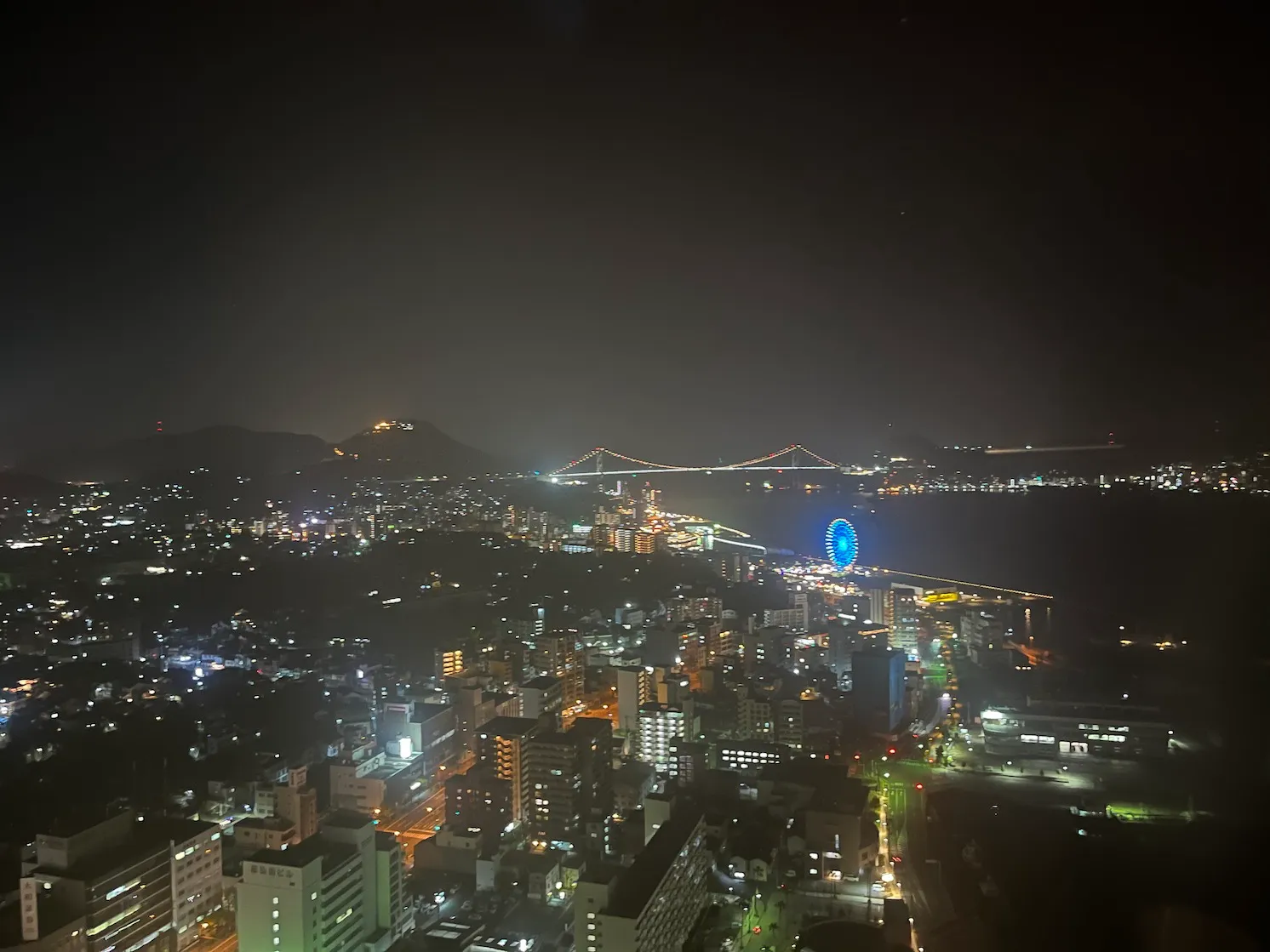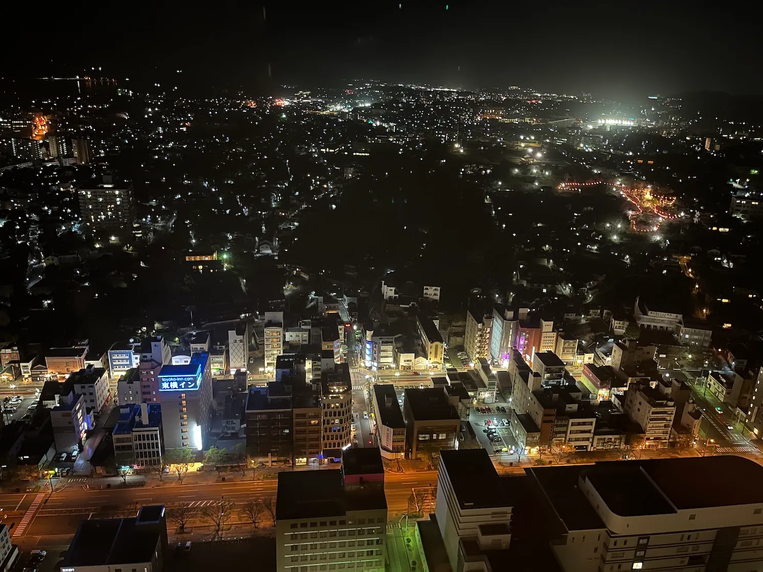 아래쪽에 보이는 제가 오늘 묵는 호텔인 '도미 인 시모노세키', 그리고 중간에서 오른쪽으로 보면 밝게 보이는 것이 시모노세키역과 그 주변이네요.
