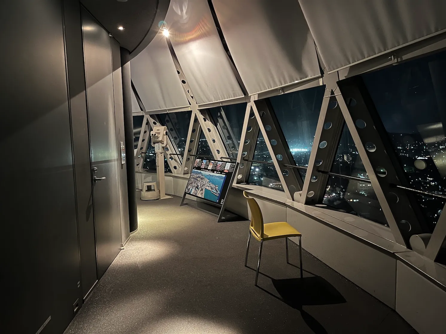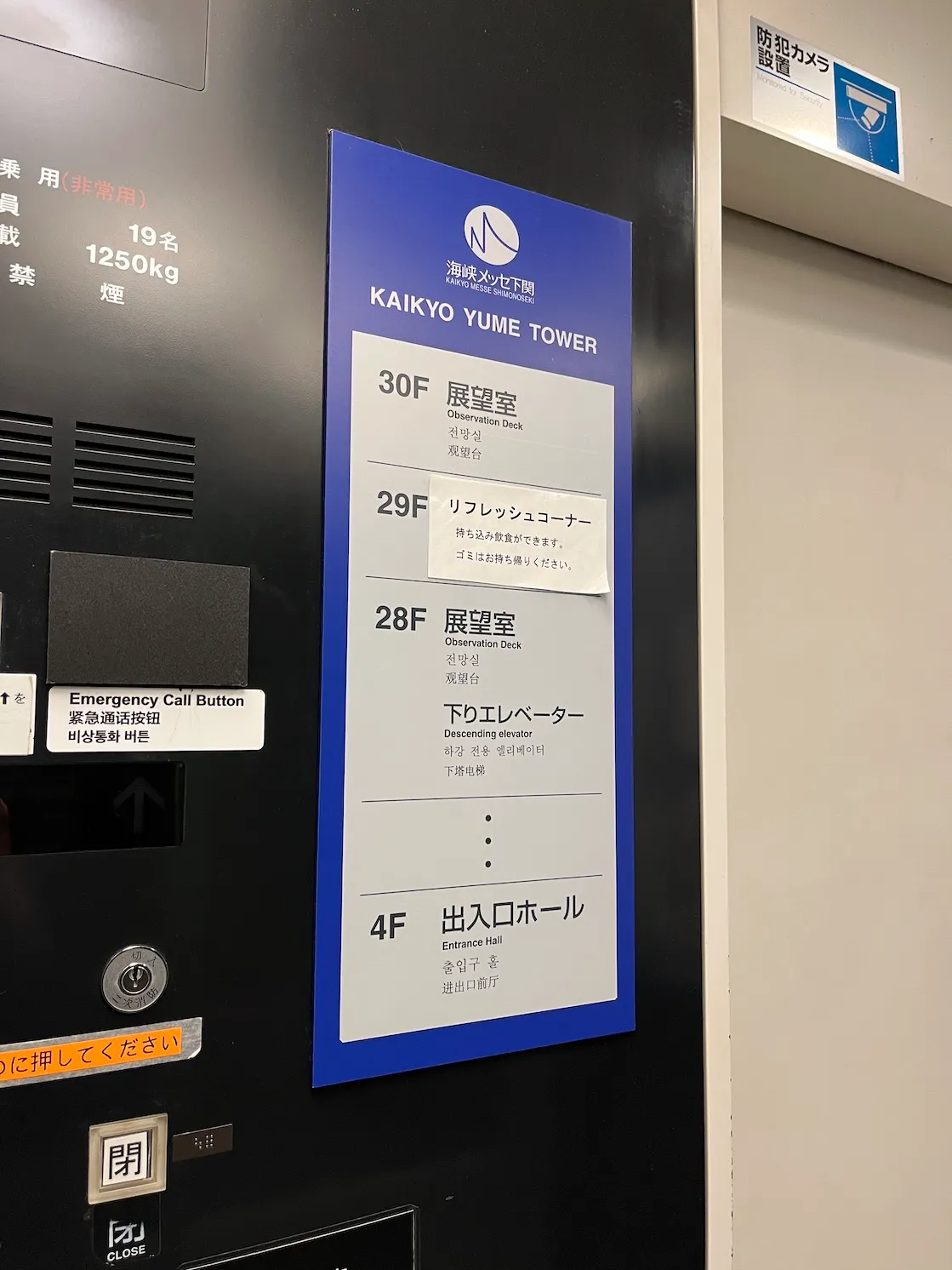 엘리베이터가 말하는(...) 이야기에 따르면, 1996년에 지어진 카이쿄유메타워는 153m 높이, 전망대는 143m 높이라고 하며, 구 모양의 전망대에서는 칸몬해협과 세토내해가 보인다고 하네요.