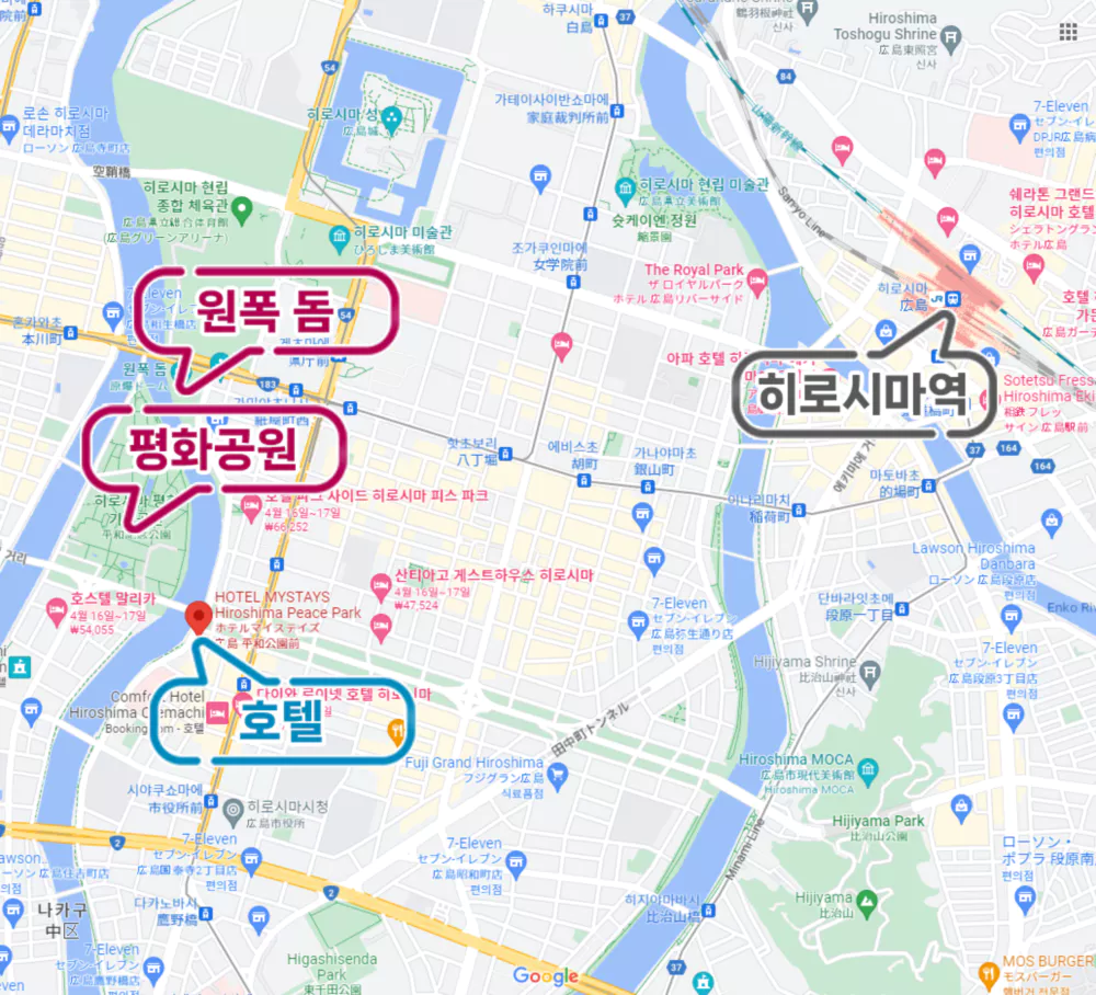 위의 지도를 보시면 호텔은 히로시마 평화공원 근처에 있습니다. 히로시마역에서는 걸어서 가기엔 조금 거리가 있고, 히로시마역 앞에서 노면전차를 타고 '주덴마에' 정류장에서 내리면 가깝습니다. 노면전차 1호선을 타면 히로시마역에서 주덴마에 정류장까지 한 번에 갈 수 있습니다.