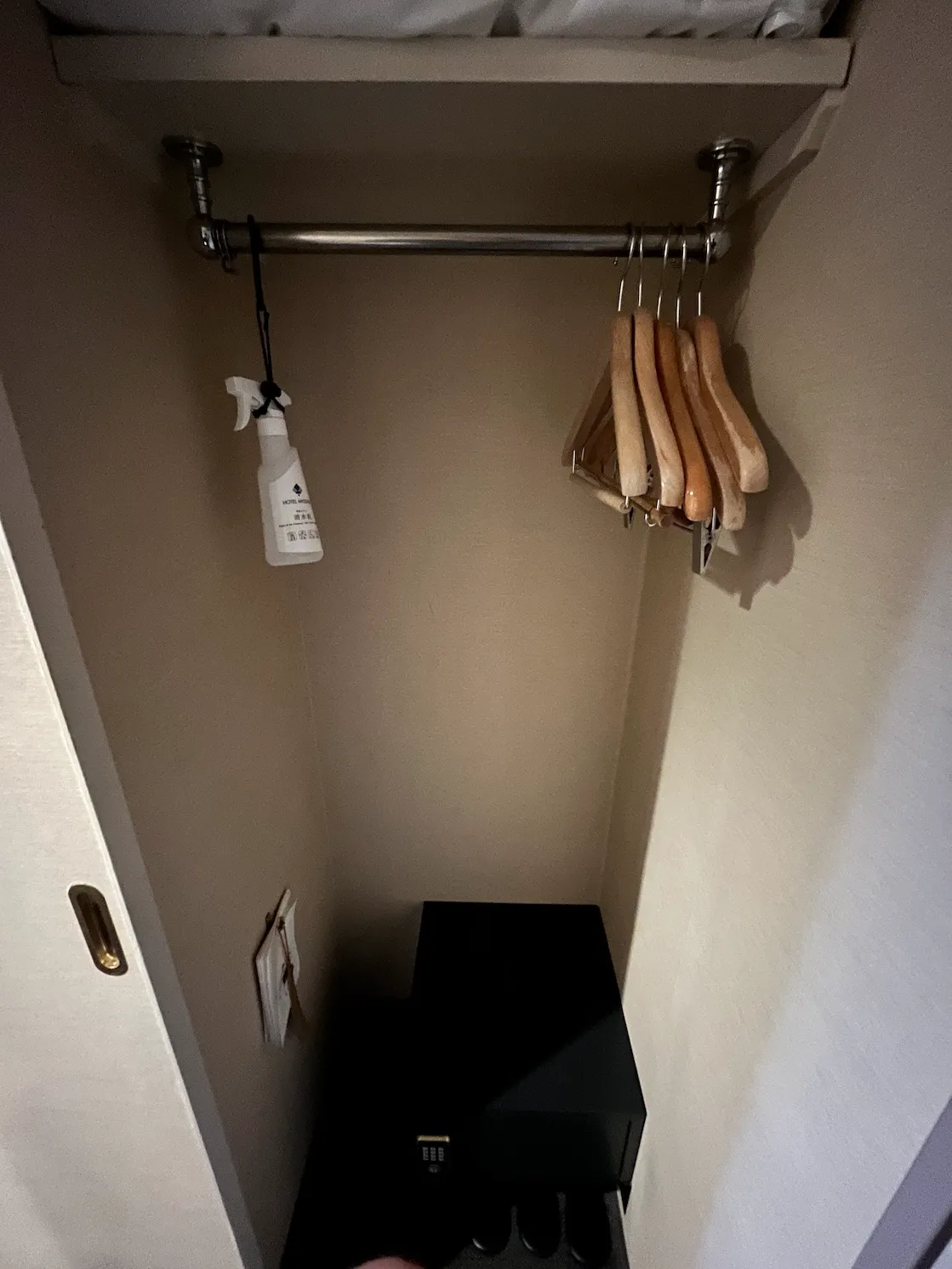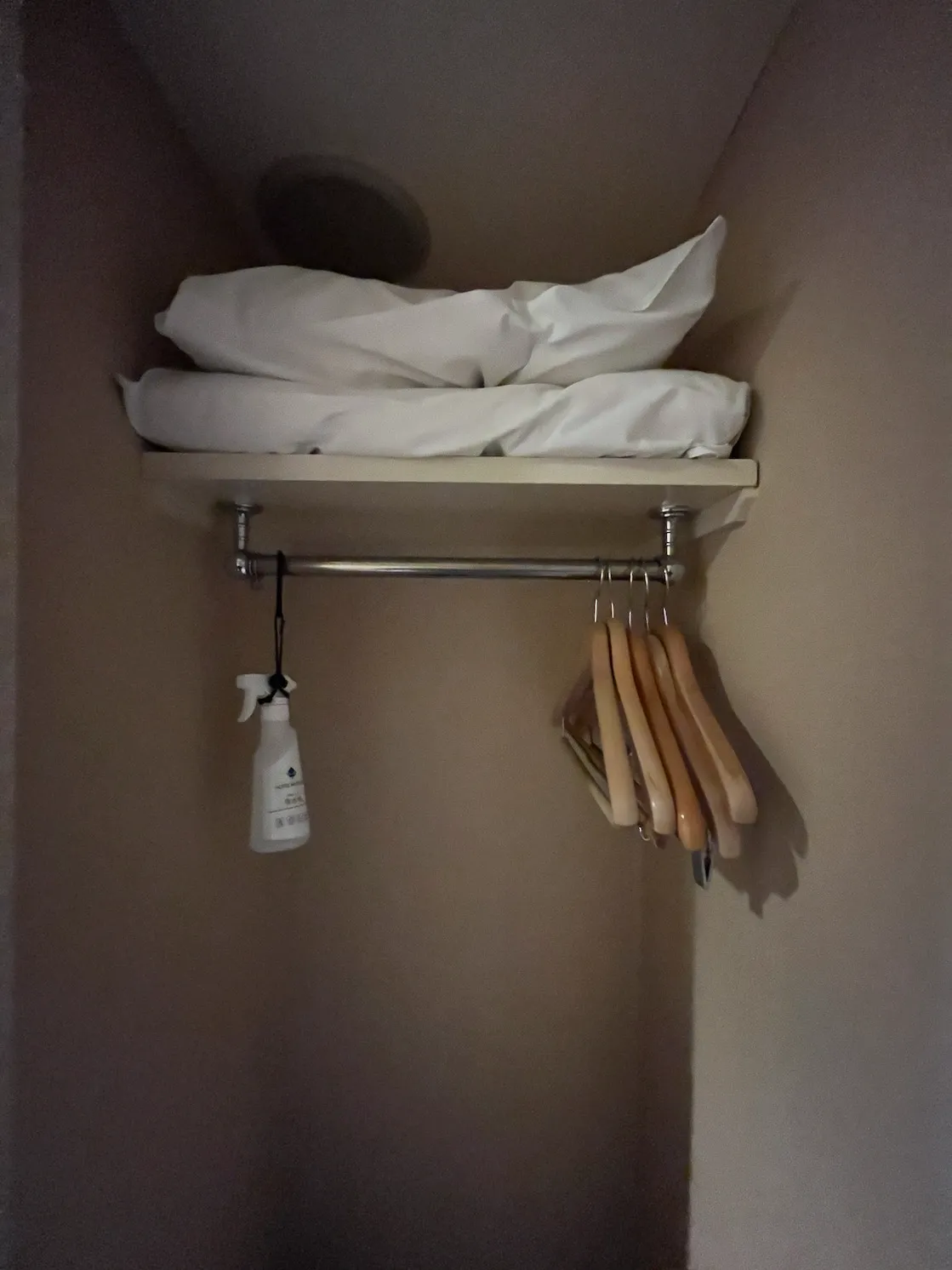 슬라이딩 도어 형태로 되어 있고, 옷장 위에는 여분의 베개, 아래쪽에는 구두주걱이 있습니다. 탈취제도 걸려있습니다.