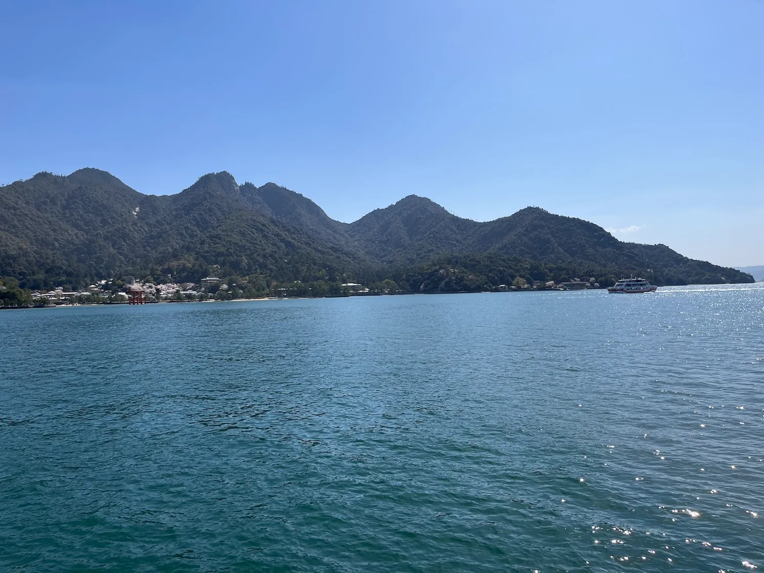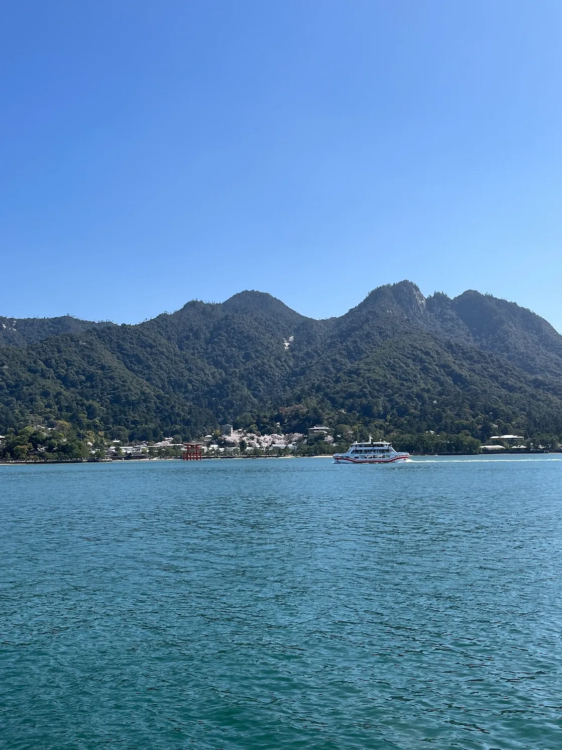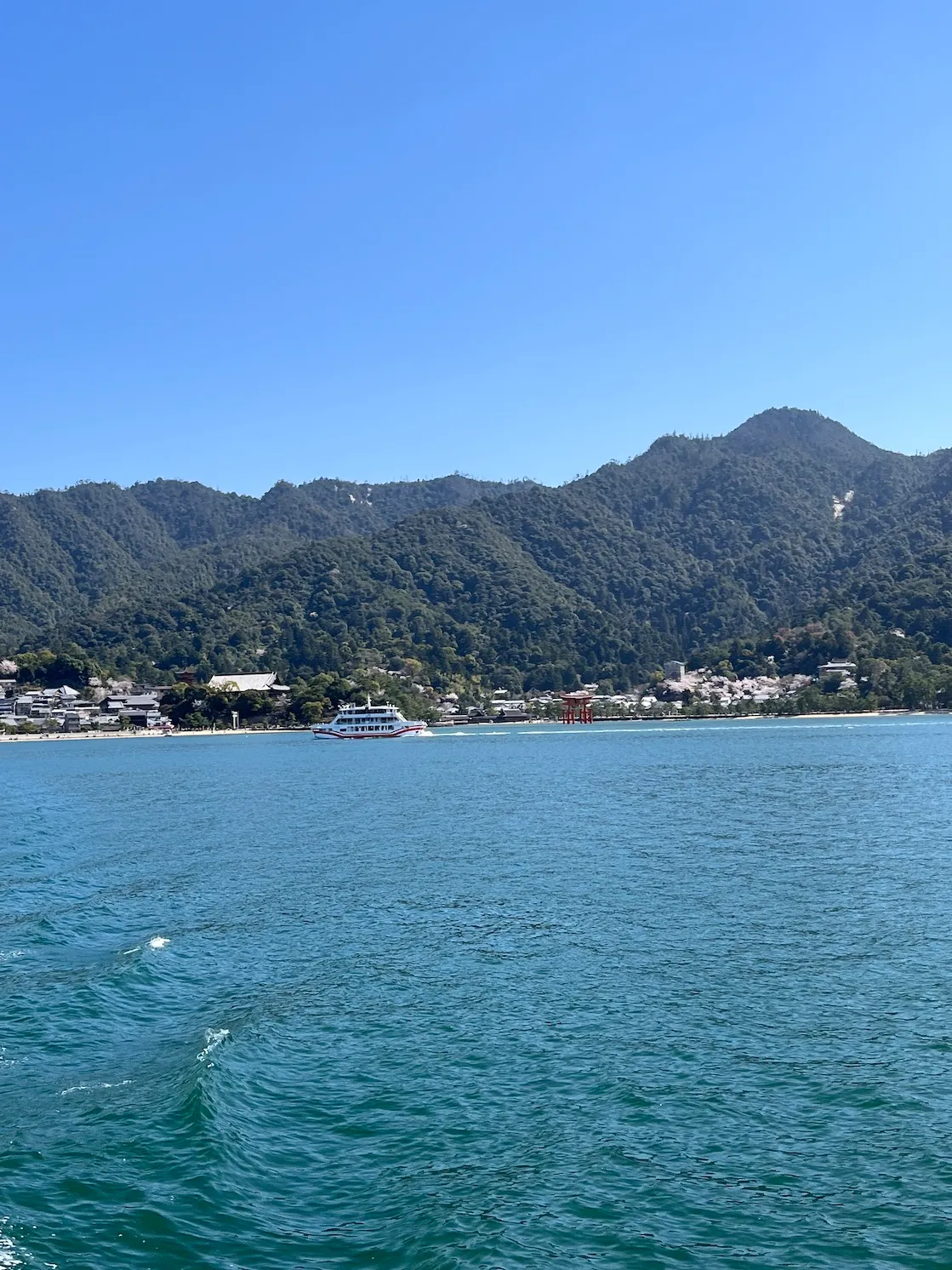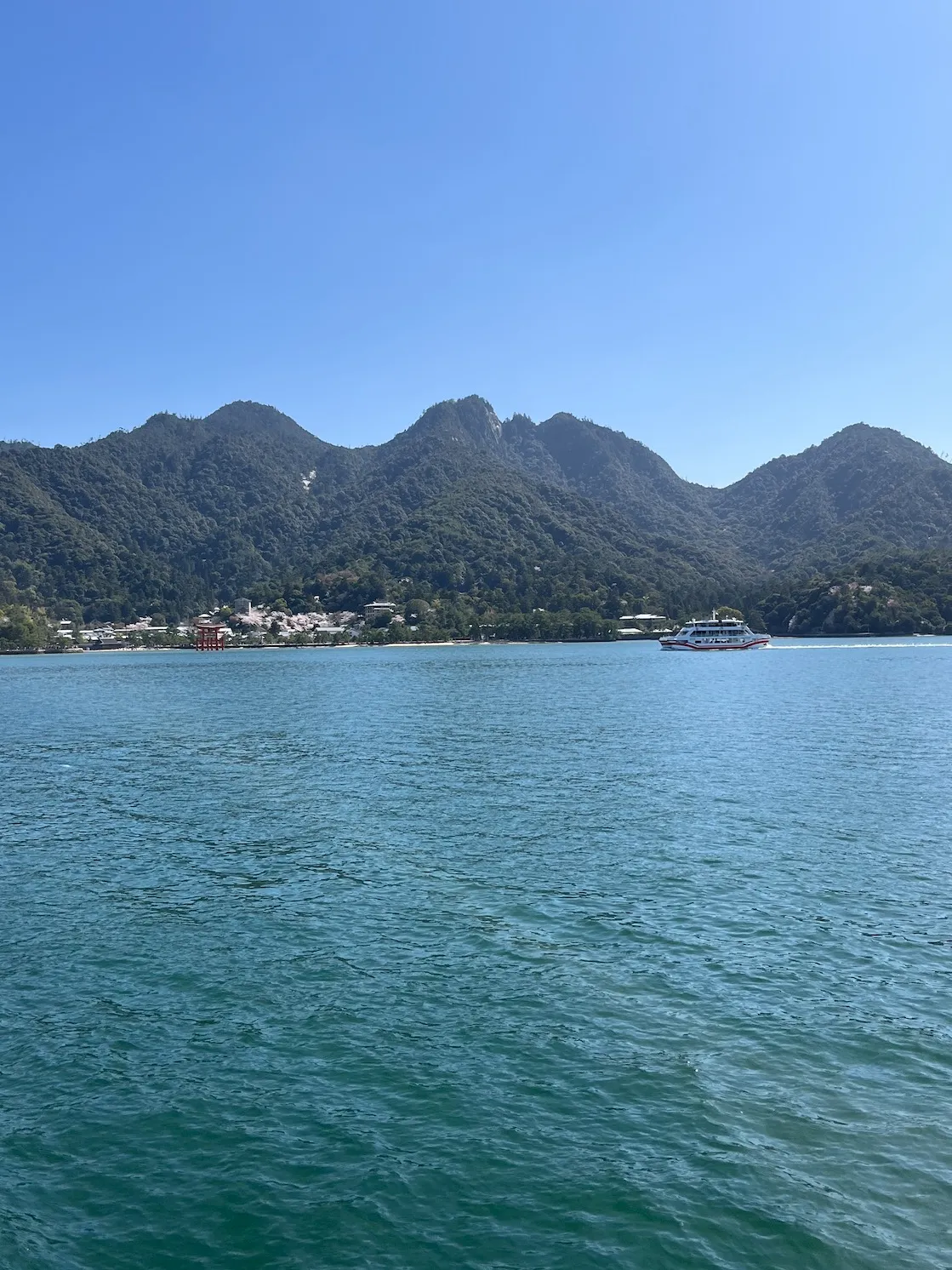 저 멀리서 우리와 반대로 미야지마항으로 가는 페리가 가고 있네요.