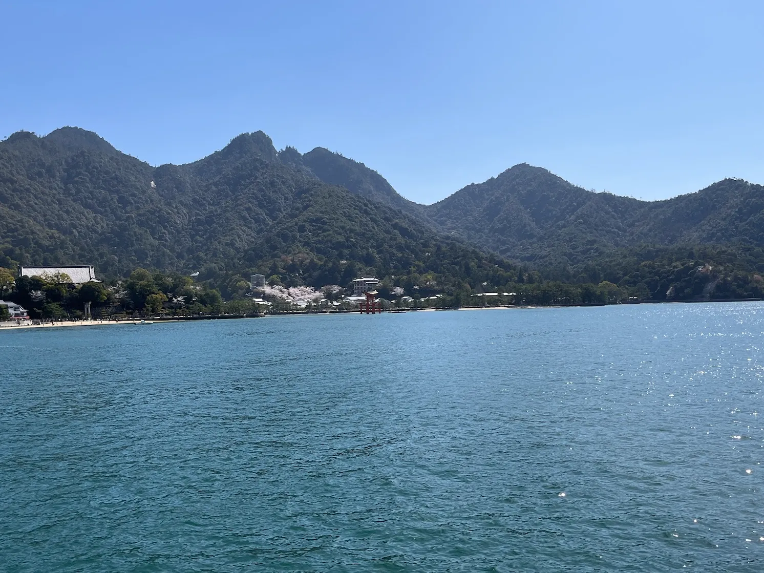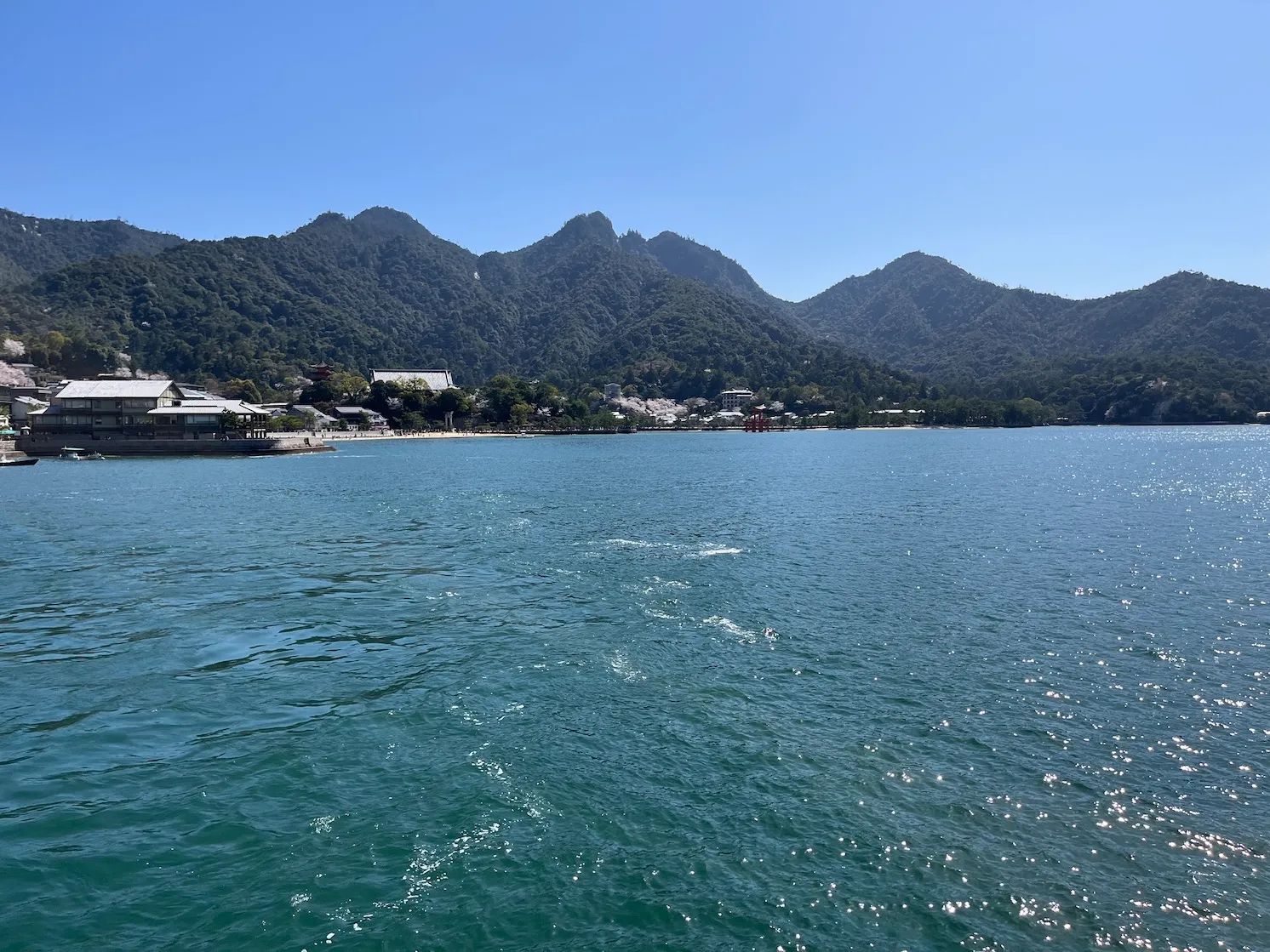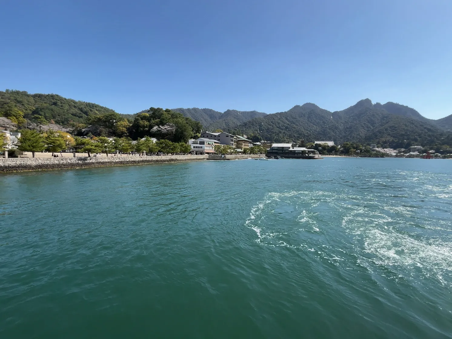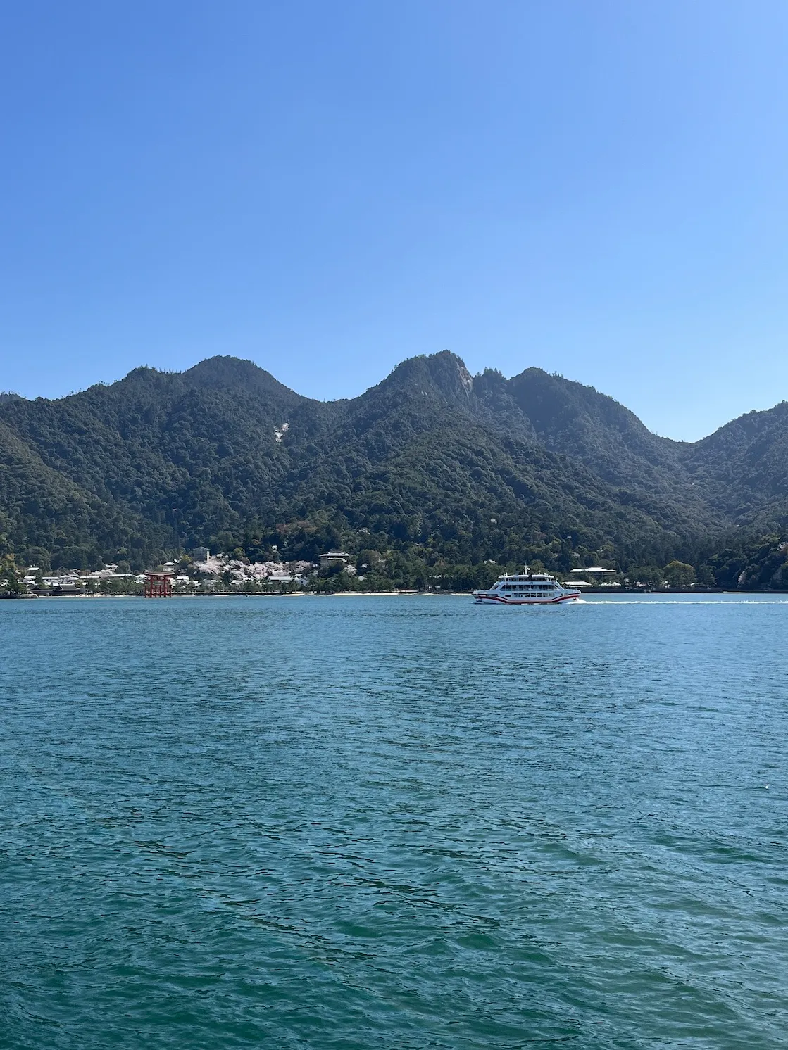 저 멀리서 우리와 반대로 미야지마항으로 가는 페리가 가고 있네요.