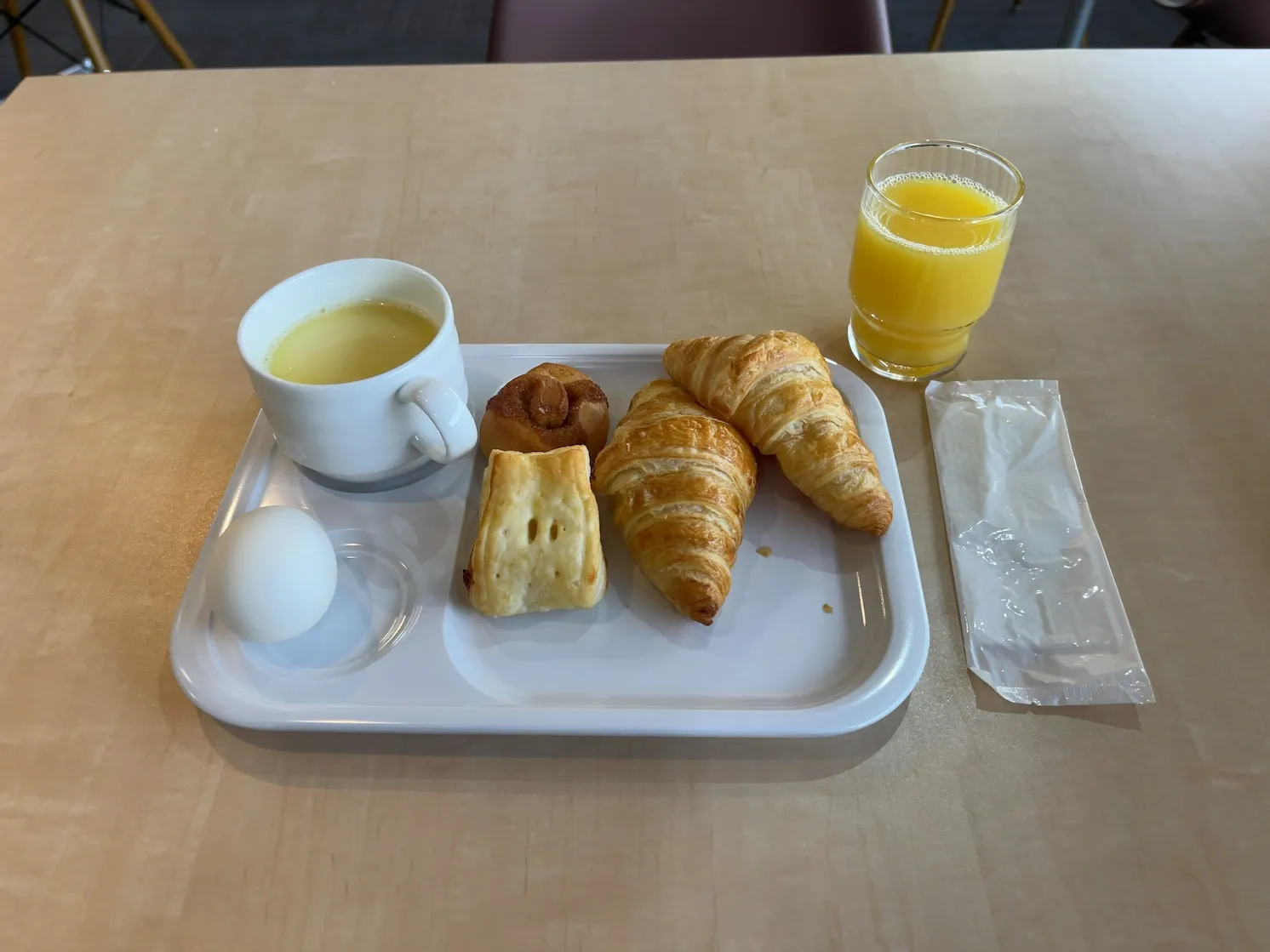 먹고 나니 버터롤이 채워져서 빵 몇 개와 주스, 계란 1개를 추가로 가져왔어요.