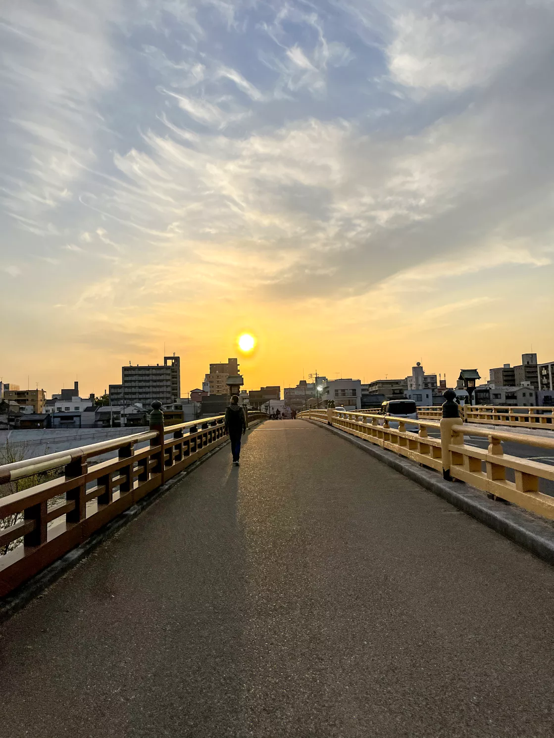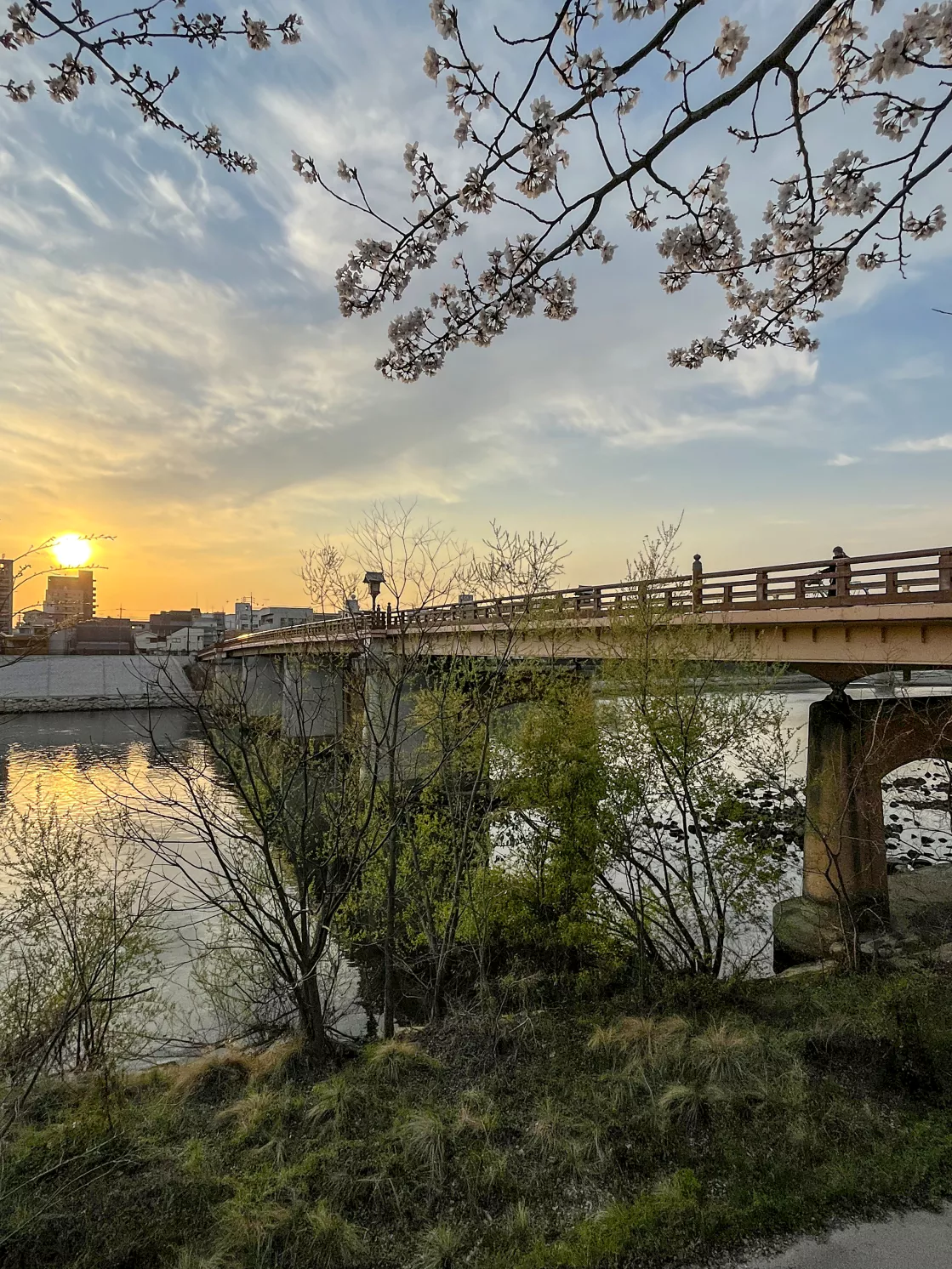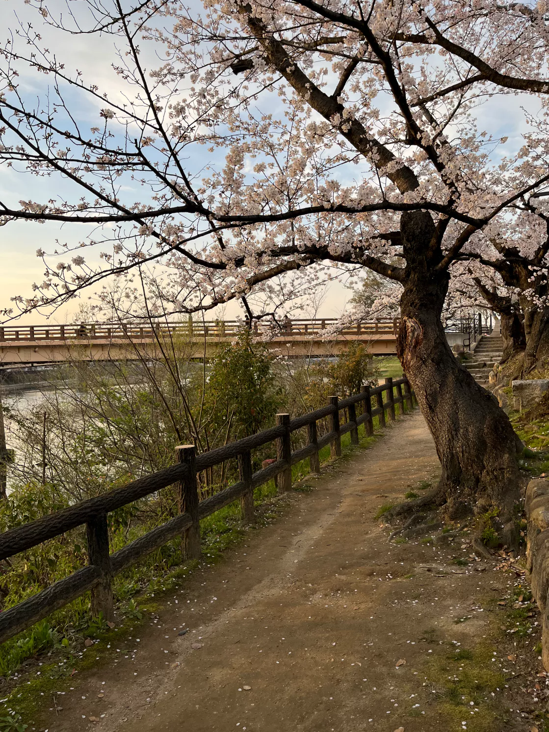 다리와 강, 벚꽃과 일몰의 노을이 더해져 감성적인 느낌이네요.